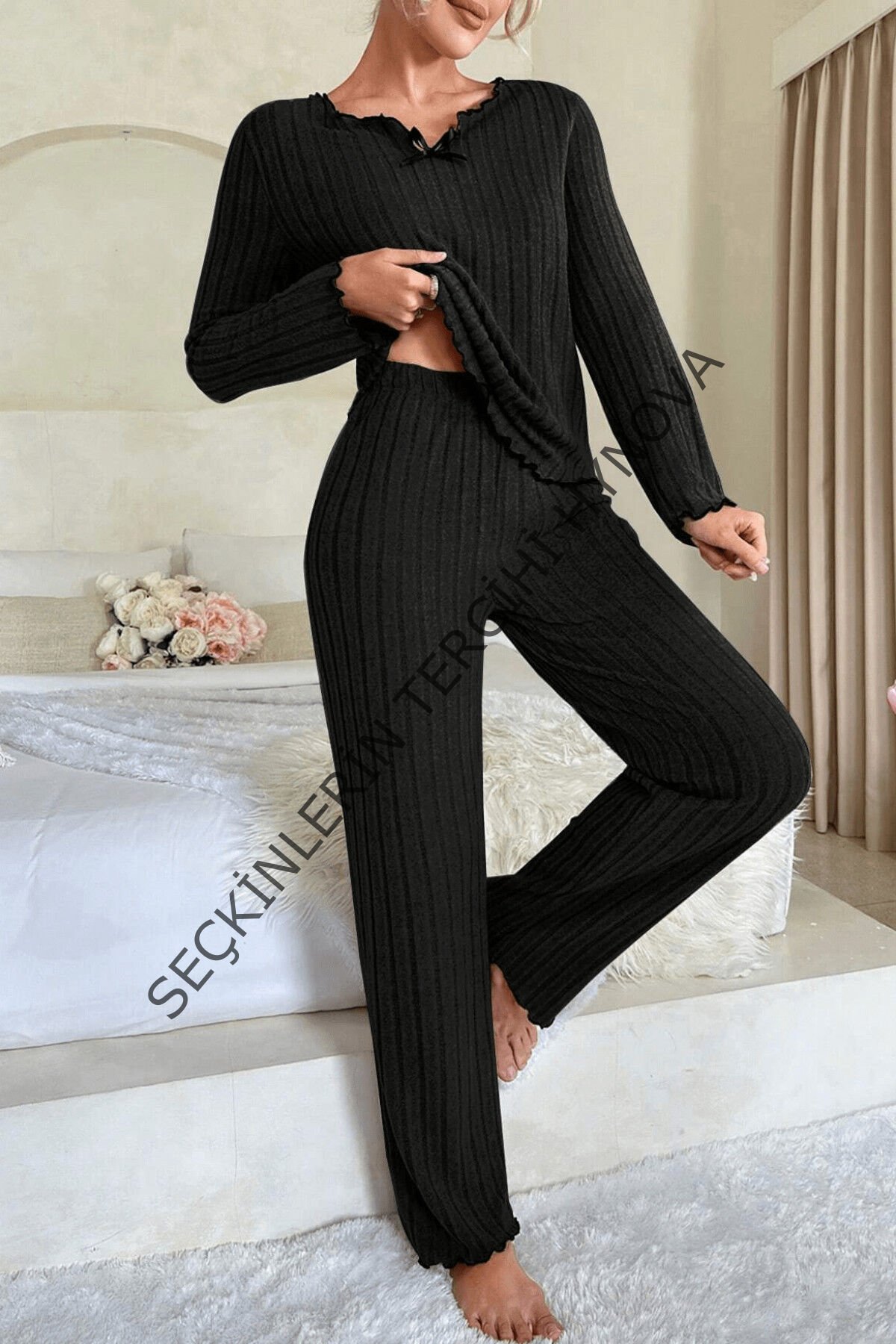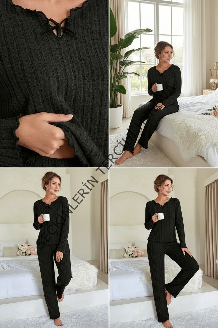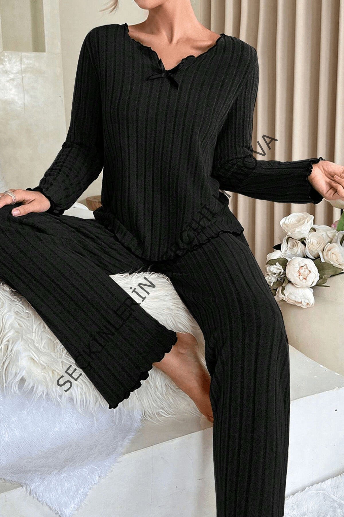 Kadın Siyah Uzun Kollu Fiyonklu Yuvarlak Yaka Mevsimlik Pijama Takımı