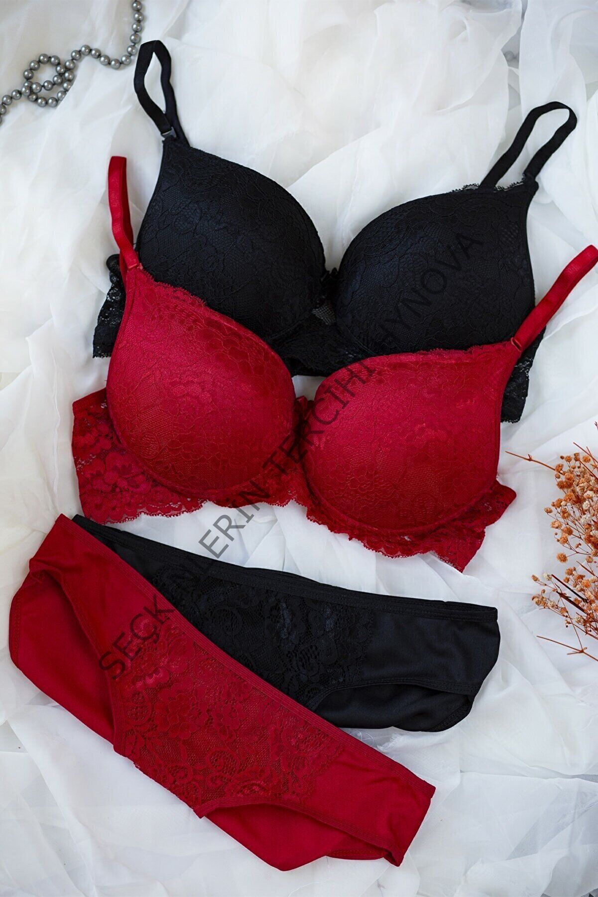 Kadın Siyah Ve Kırmızı Dolgulu Balenli Sütyen Külot 2'li Paket – Modern ve Şık Tasarım