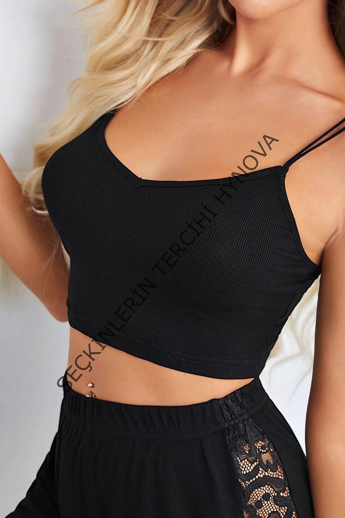 Kadın Siyah Yanları ve Sırtı Dantel Detaylı Çift Sıra İnce Lastikli Şortlu Gecelik Takım