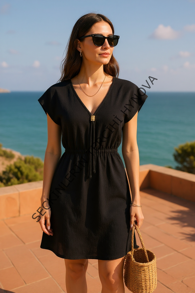Kadın Siyah Yanları Yırtmaçlı Tokalı V Yaka Mini Plaj Elbisesi – Şık, Rahat ve 4 Mevsim Kullanıma Uygun