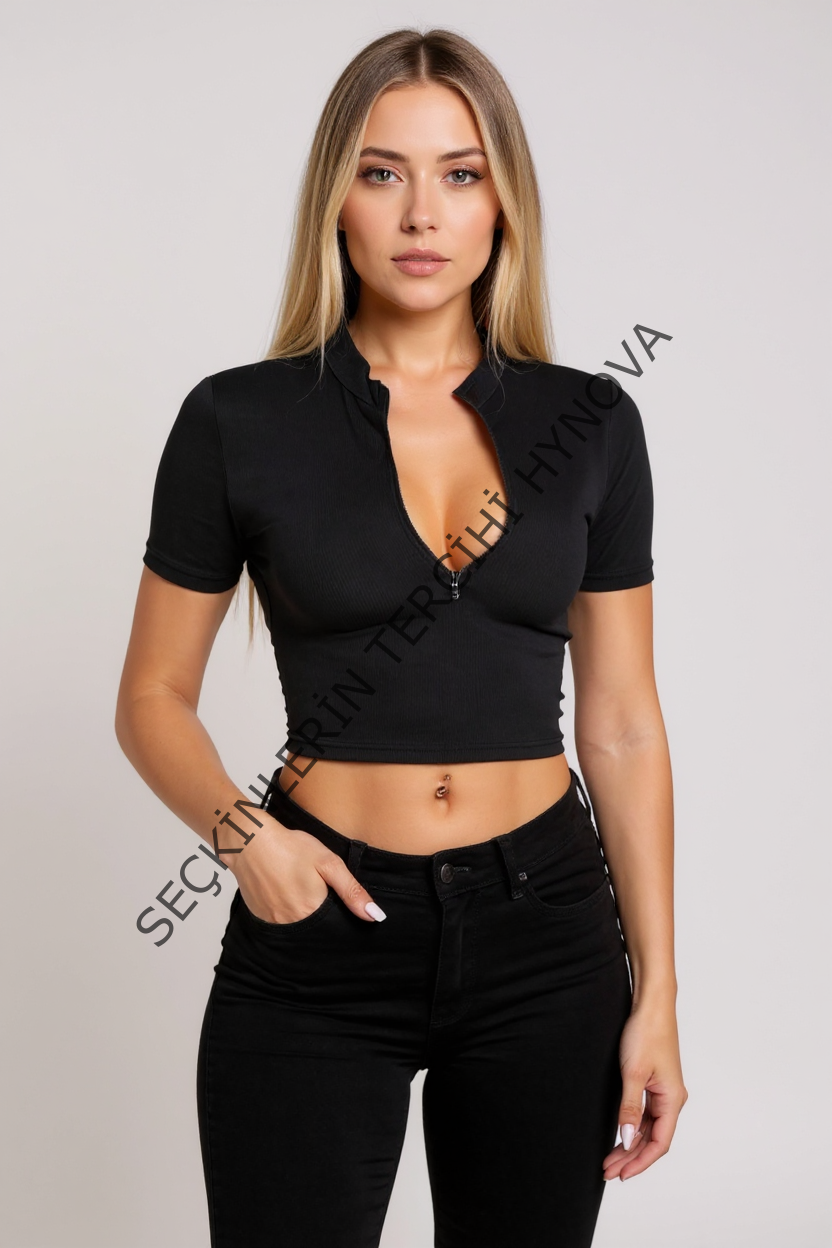 Kadın Siyah Yarım Fermuarlı ve Kısa Kollu Crop Top Bluz