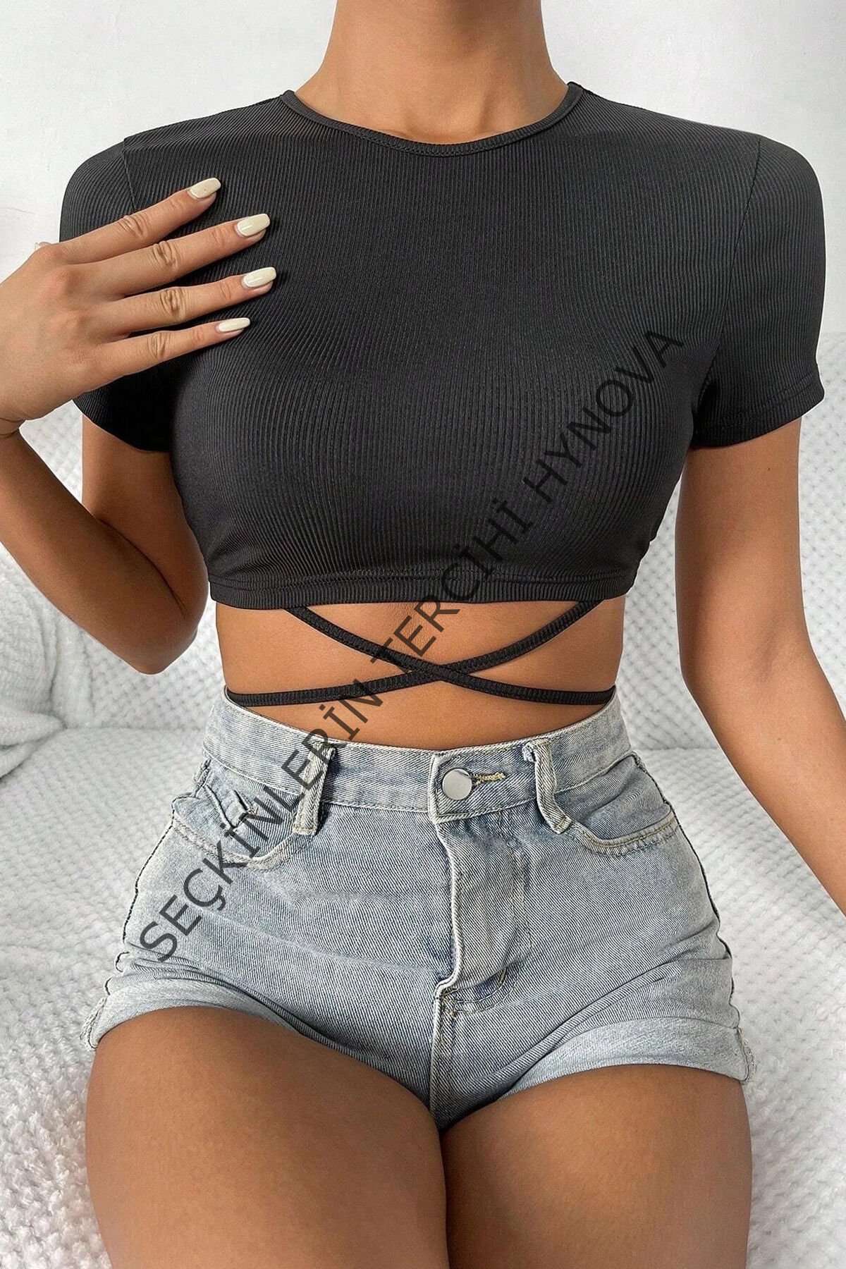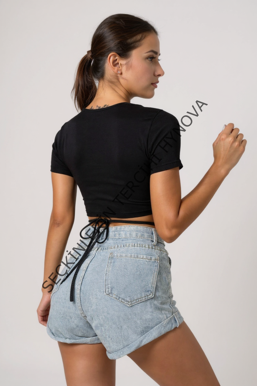 - Yarım Kol Çapraz Bağlamalı ve Yuvarlak Yaka Crop Top Bluz.