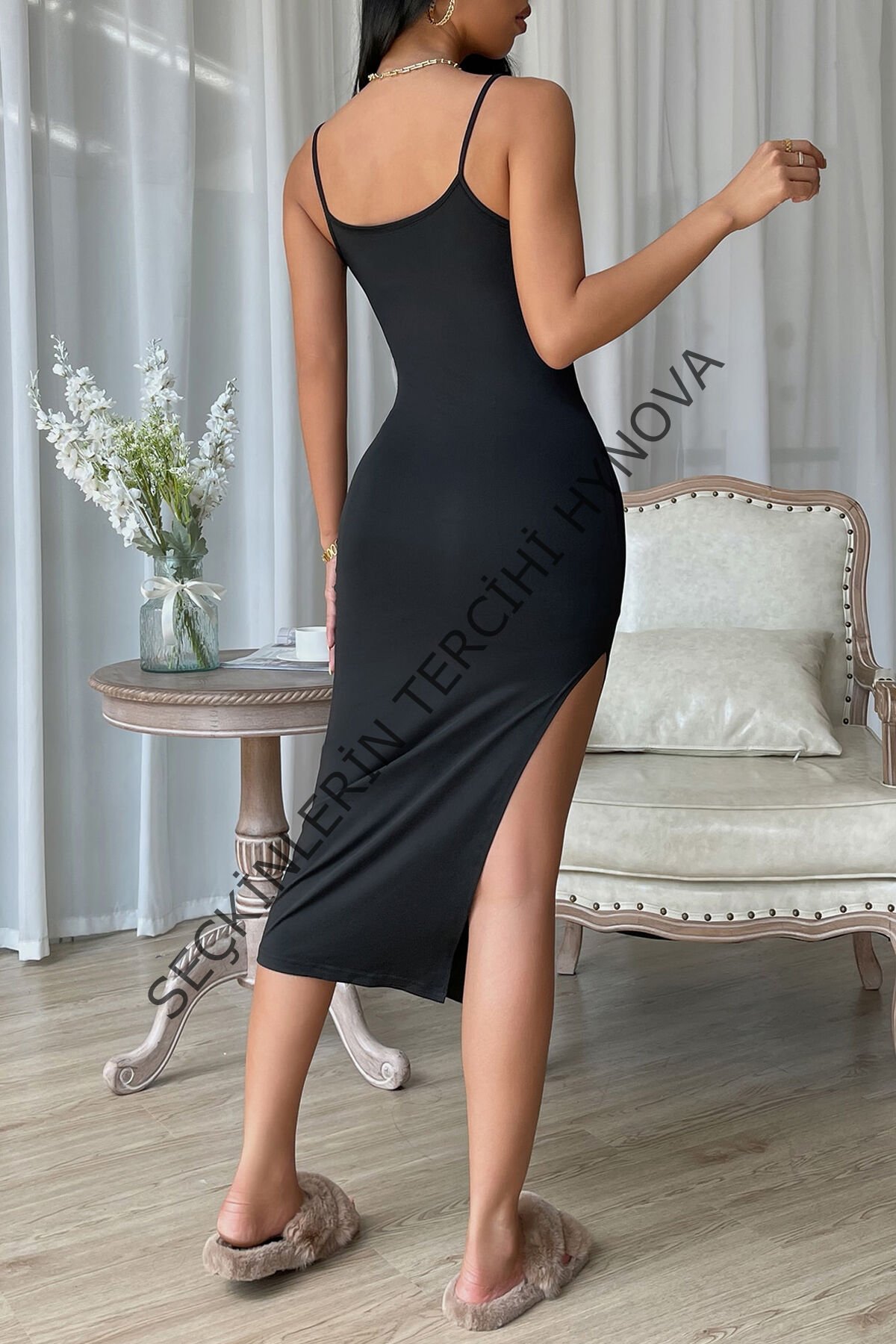Kadın Siyah Yırtmaçlı Diz Altı Vücüdu Saran Gecelik