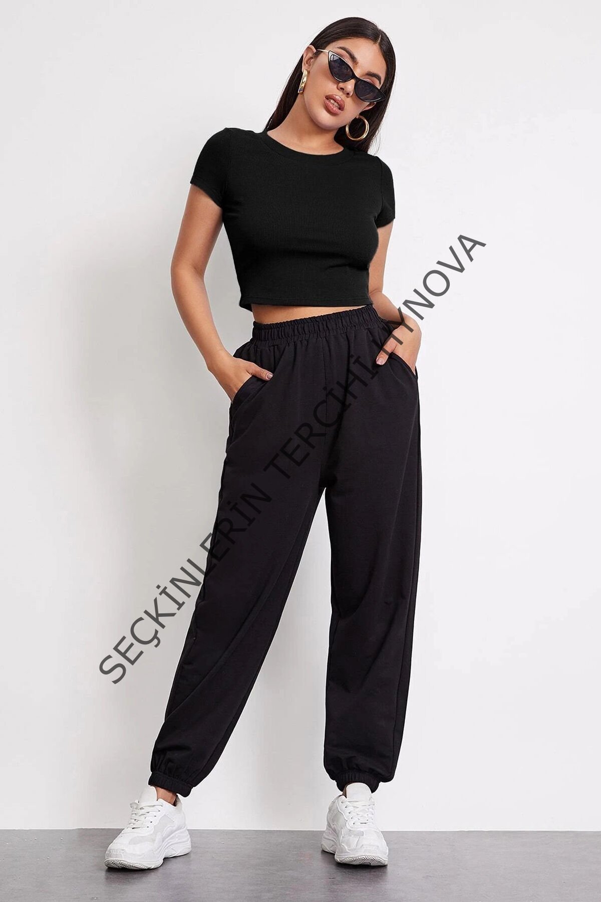 Kadın Siyah Yuvarlak Yaka Yarım Kol Crop Top Bluz – Şık, Rahat ve Kolay Kombinlenebilir