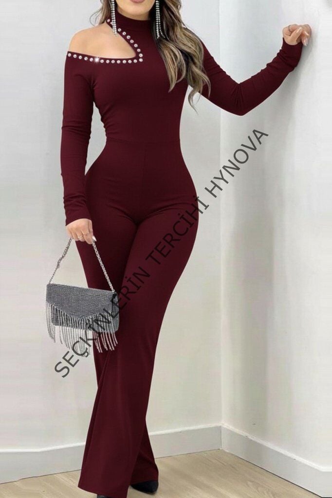 Kadın Tek Omuzdan Açık Balıkçı Yaka Taş Detaylı Uzun Ithal Krep Tulum 178449