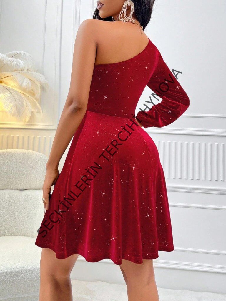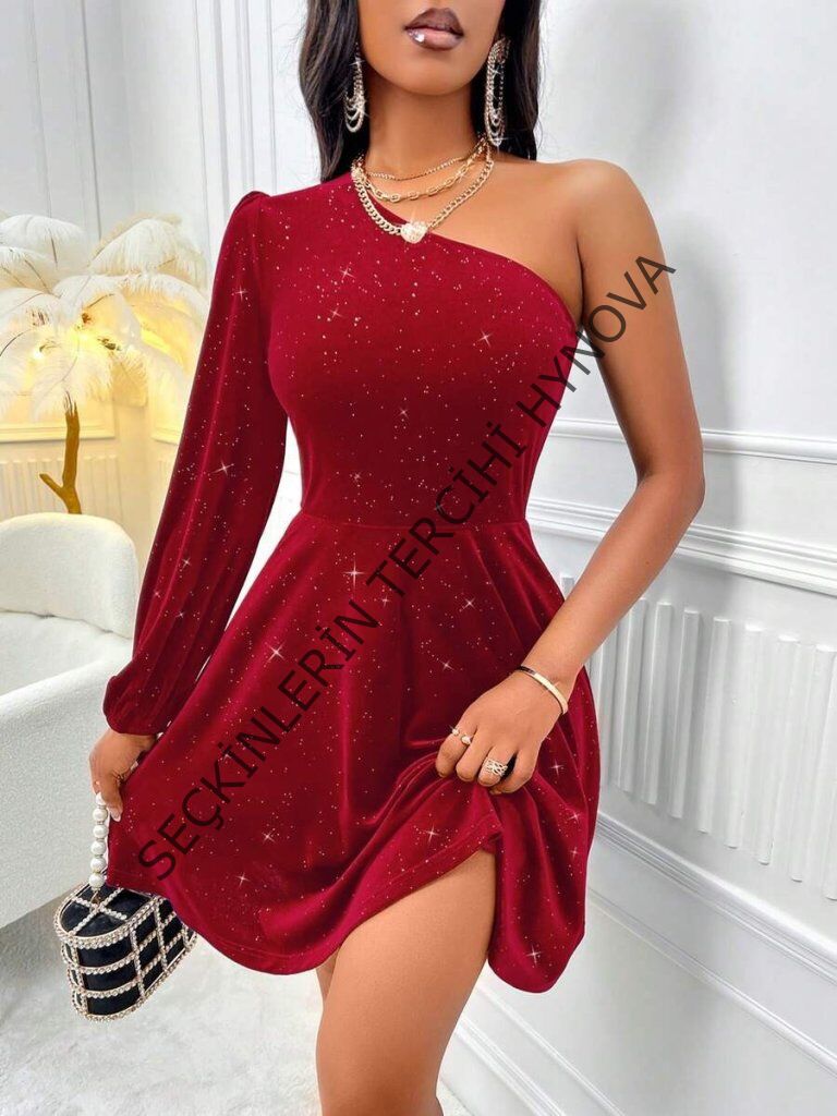Kadın Tek Omuzdan Açık Uzun Kollu Taşlı Mini Elbise