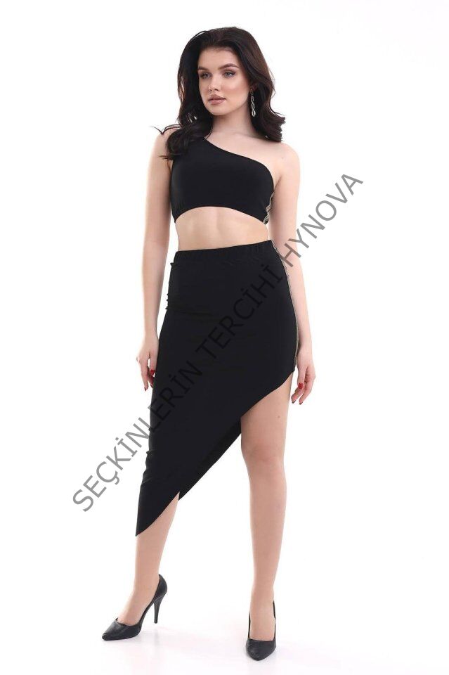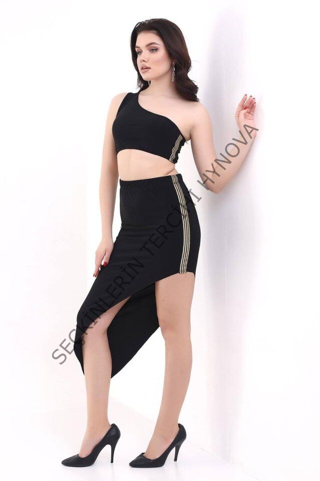 Kadın Tek Omuzlu Asimetrik Etek Şerit Detaylı Fırsat Ürün Sandy Kumaş İkili Takım