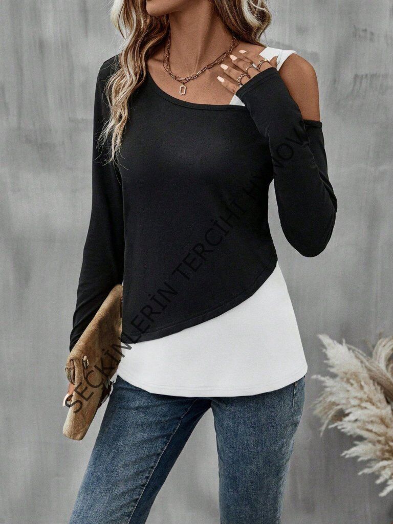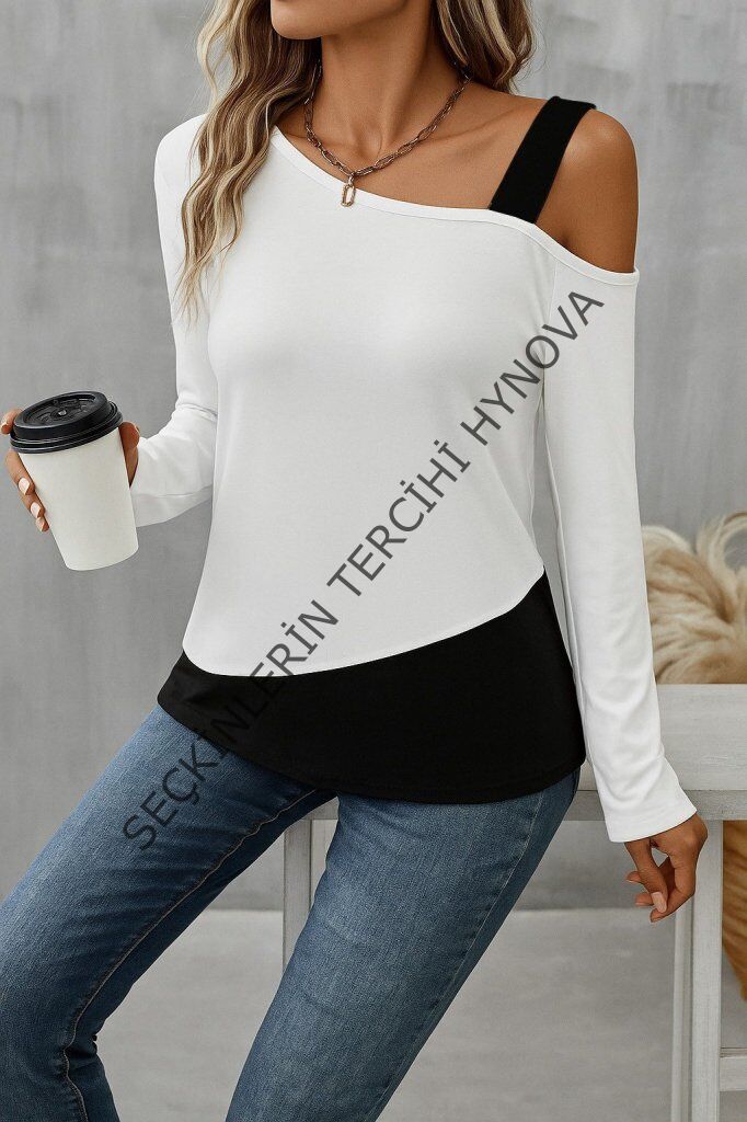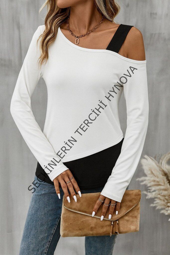 Kadın Tek Omuzu Açık Askılı çift Renkli Uzun Kollu Viskon Bluz