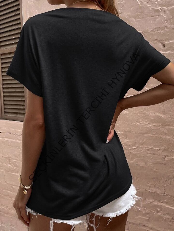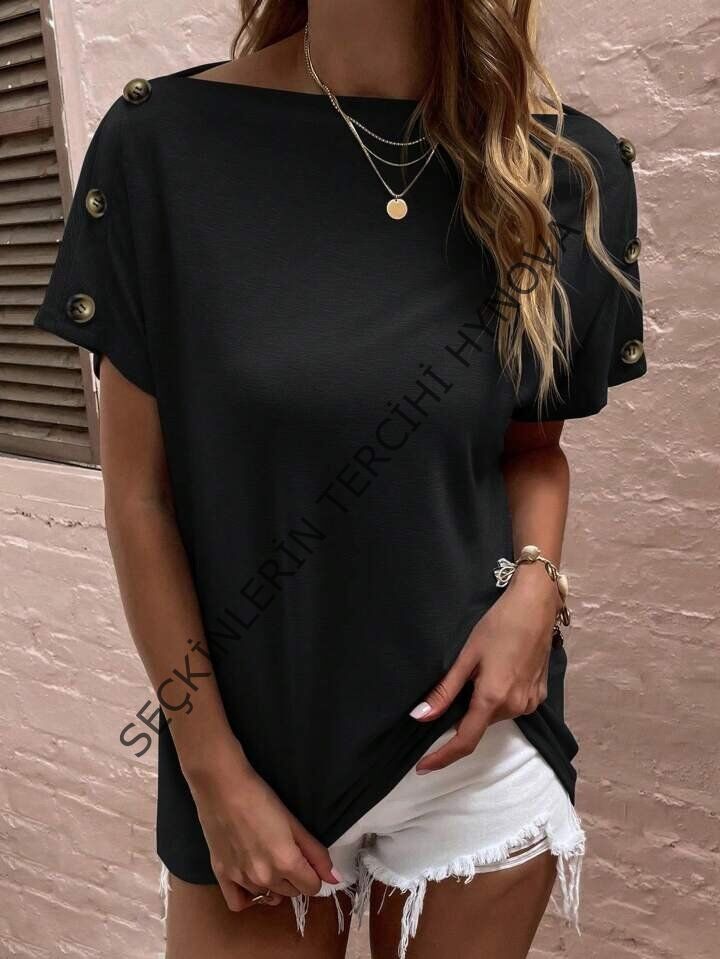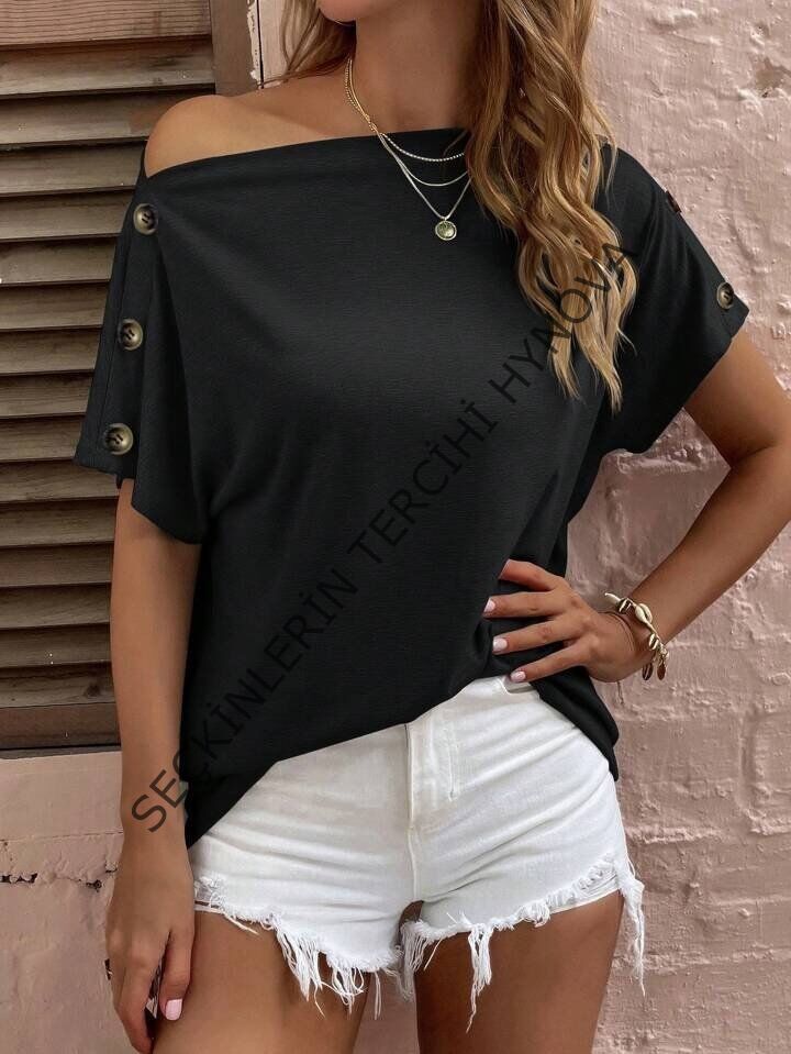 Kadın Tek Omuzu Açık Düğme Detaylı Salaş Viskon Bluz