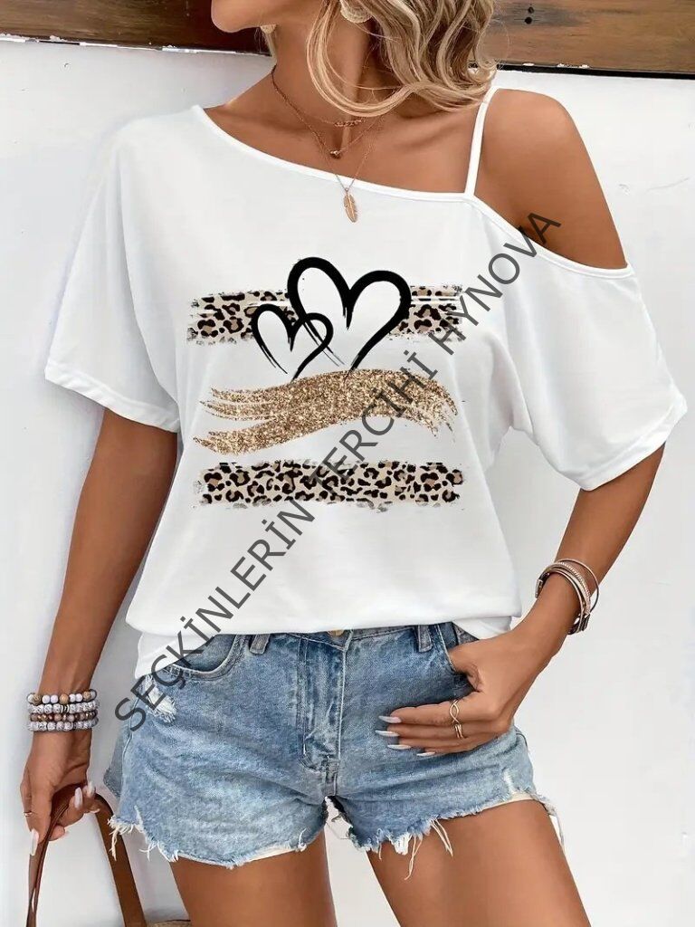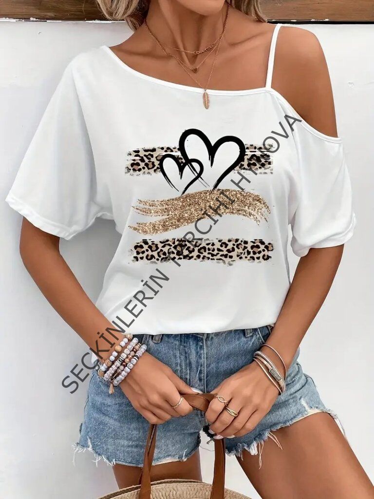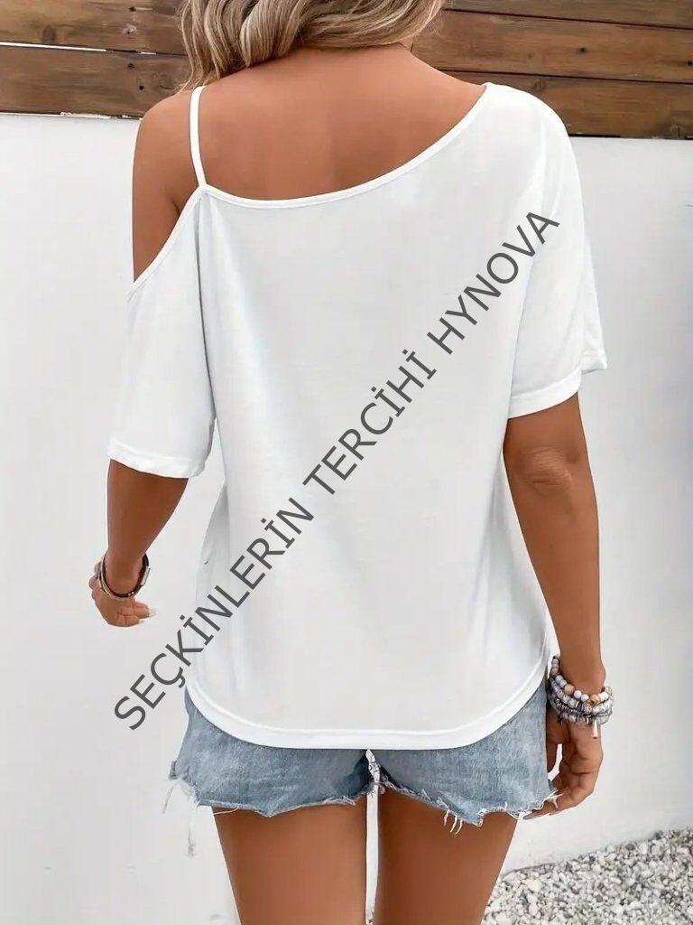 Kadın Tek Omuzu Açık Ip Askılı Baskılı Viskon Bluz