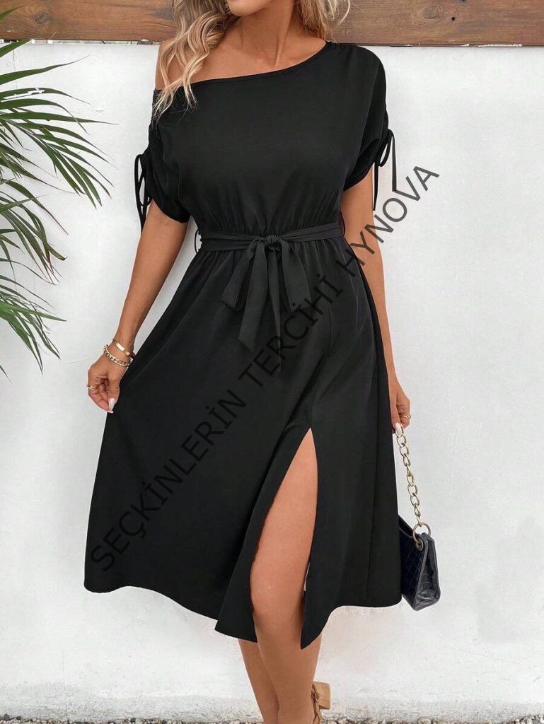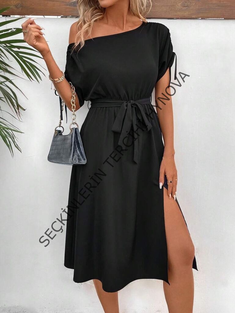 Kadın Tek Omuzu Açık Kol Ucu Fiyonklu Belden Kuşaklı Yırtmaç Detaylı Viskon Elbise
