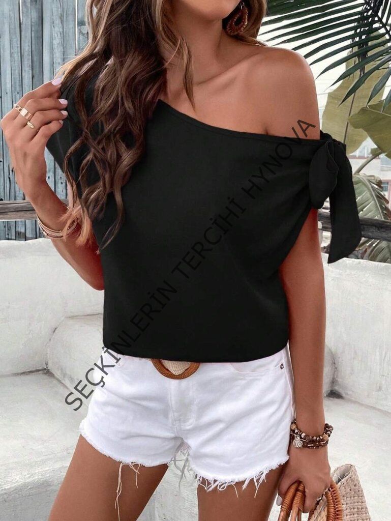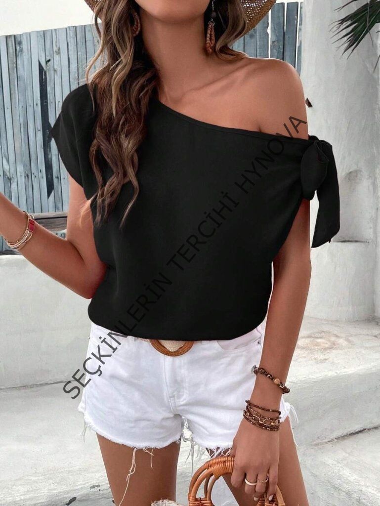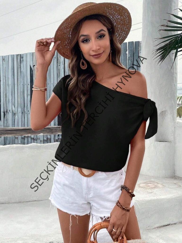 Kadın Tek Omuzu Açık Koldan Bağlamalı Janjan Krep Bluz