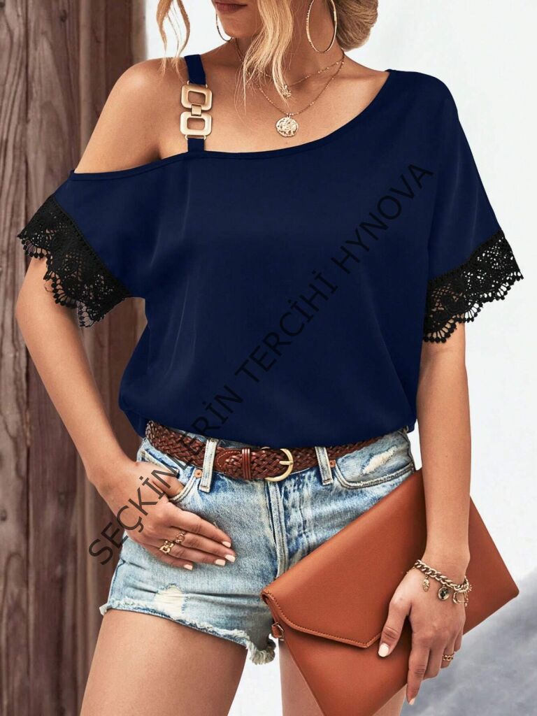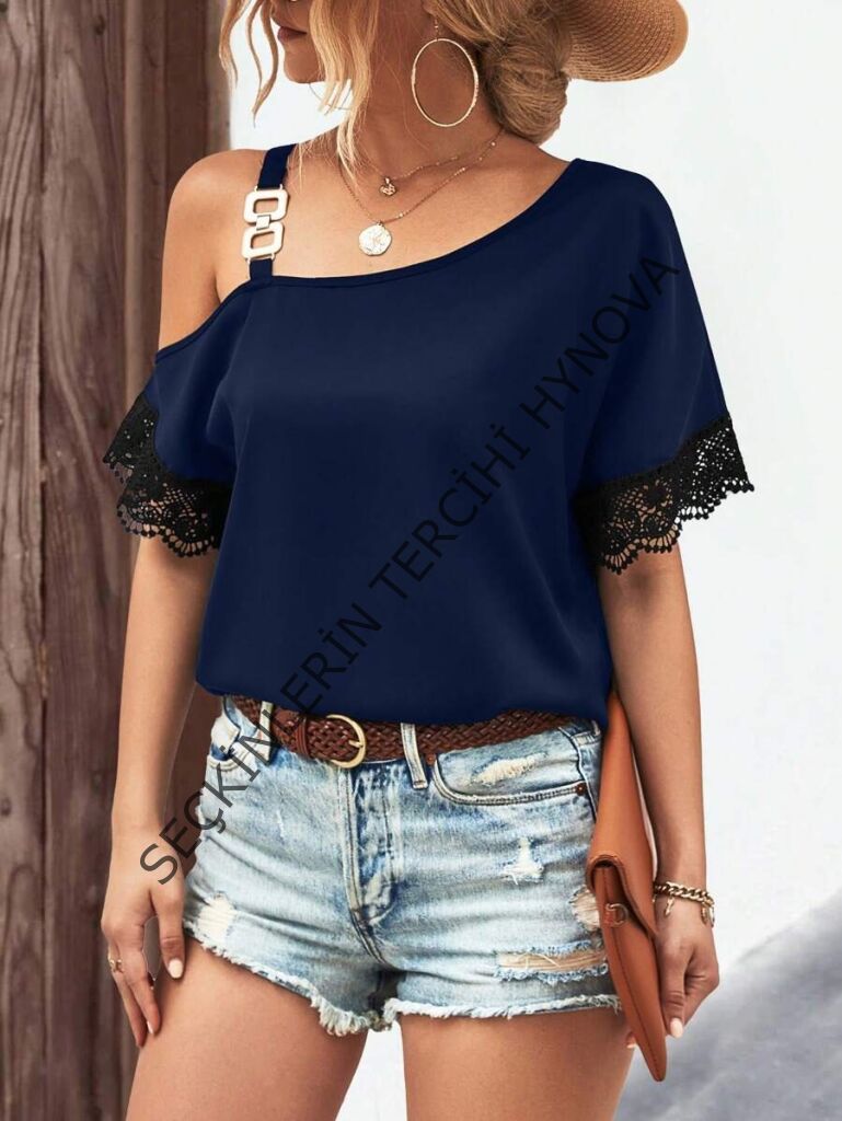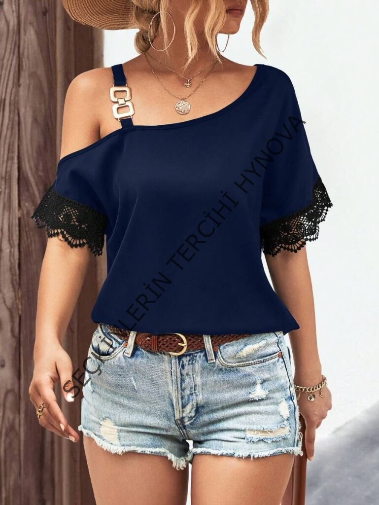 Kadın Tek Omuzu Askılı Kısa Kollu Toka Detaylı Dantelli Viskon Bluz
