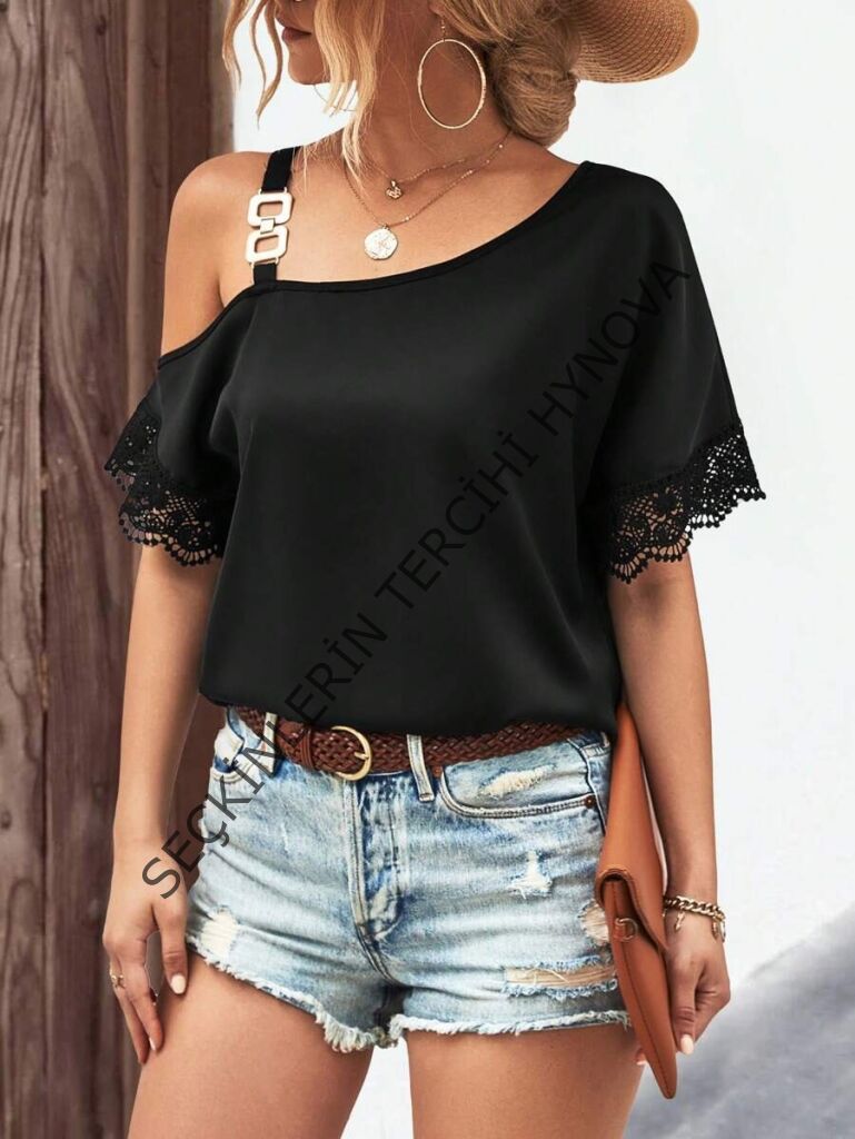 Kadın Tek Omuzu Askılı Kısa Kollu Toka Detaylı Dantelli Viskon Bluz