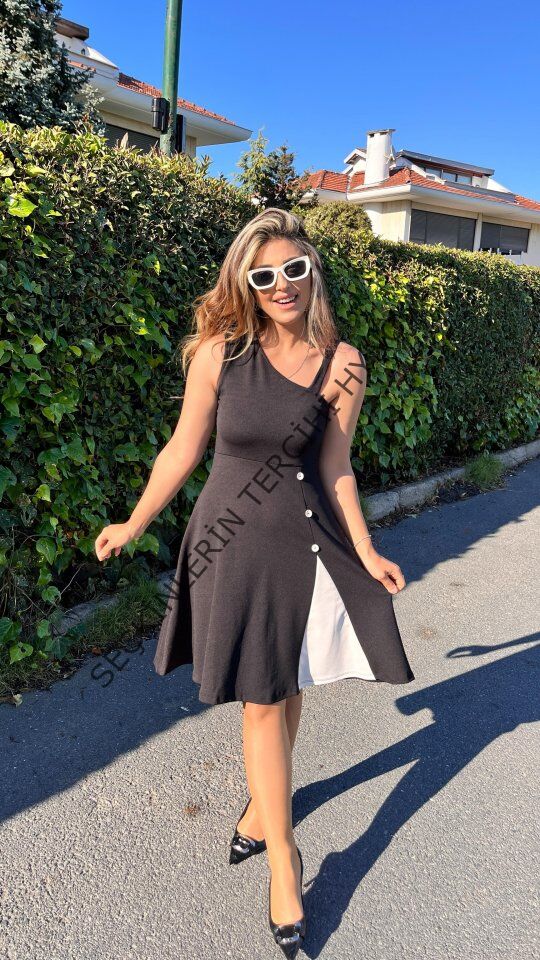 Kadın Tek Omuzu şerit Detaylı Sıfır Kol Yandan Düğme Detaylı Janjan Krep Elbise