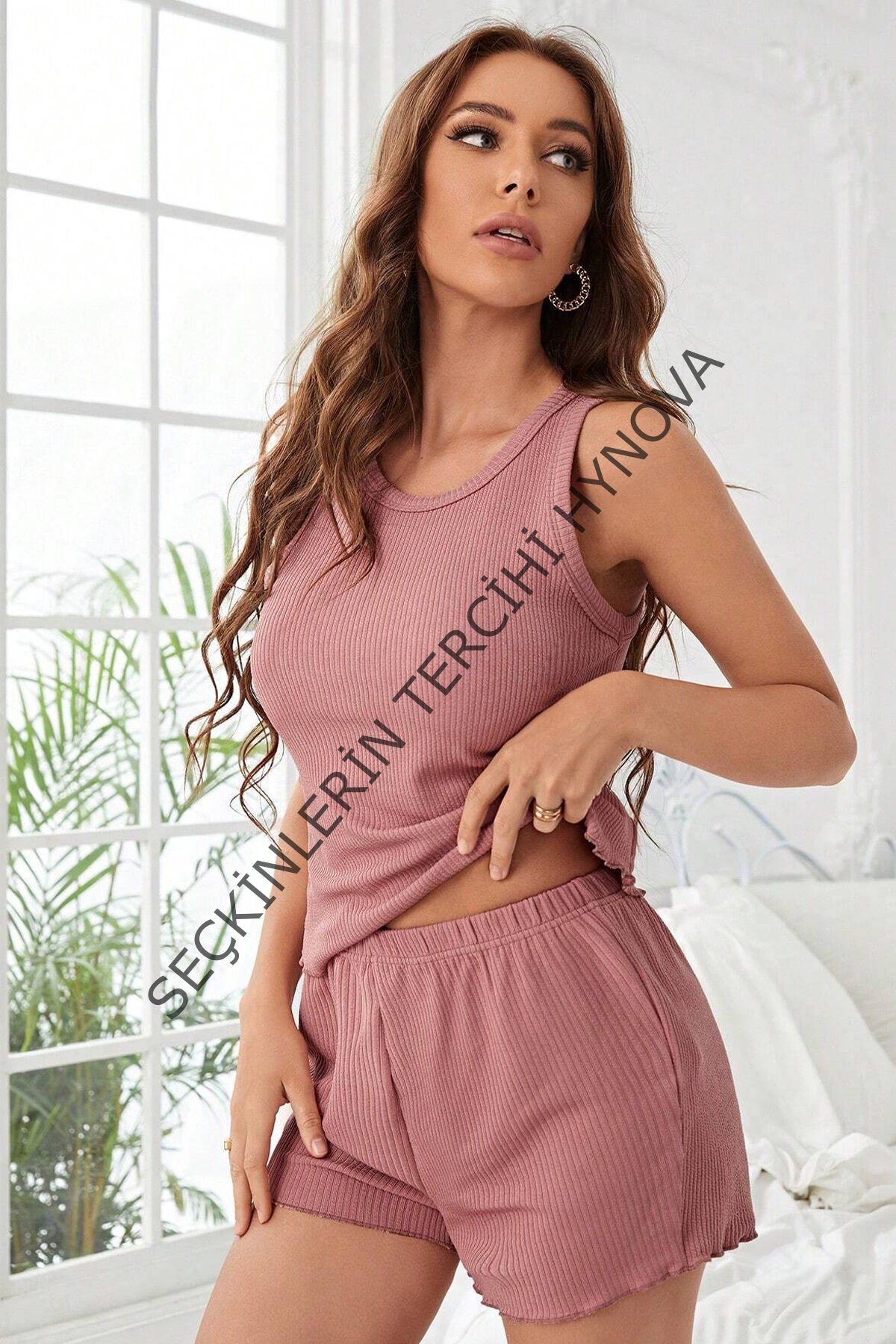 Kadın Tozlu Pembe Kenarları Fırfırlı Şortlu Kaşkorse Gecelik Takımı