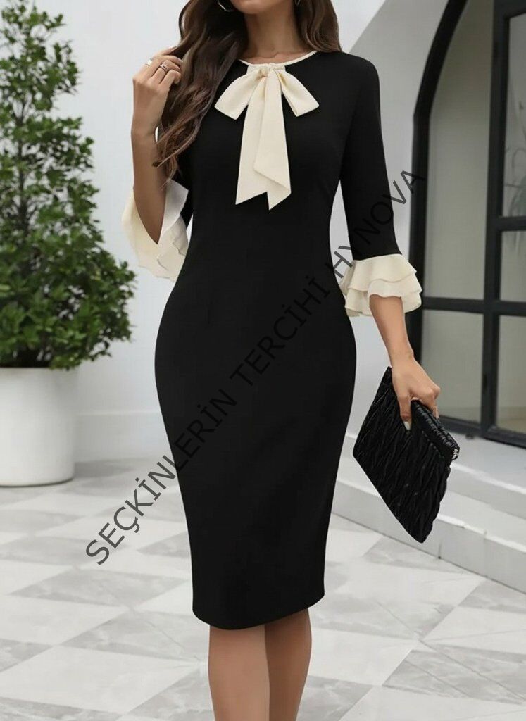 Kadın Truvakar Kollu Fiyonk Yakalı Midi Ithal Krep Elbise