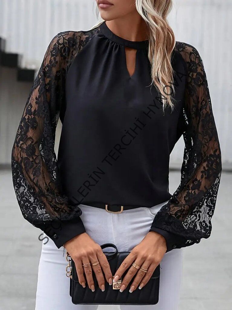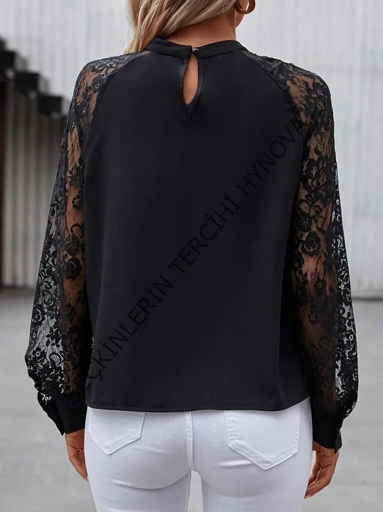 Kadın Uzun Dantel Kollu Yuvarlak Yakalı Sandy Bluz