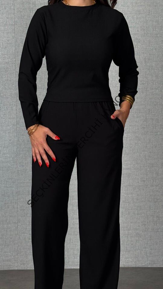 Kadın Uzun Kol Bisiklet Yaka Bürümcük Bluz Ve Pantolon Ikili Takım
