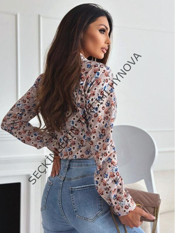 Kadın Uzun Kol Cep Detay çiçek Baskılı Mosskrep Kumaş Gömlek