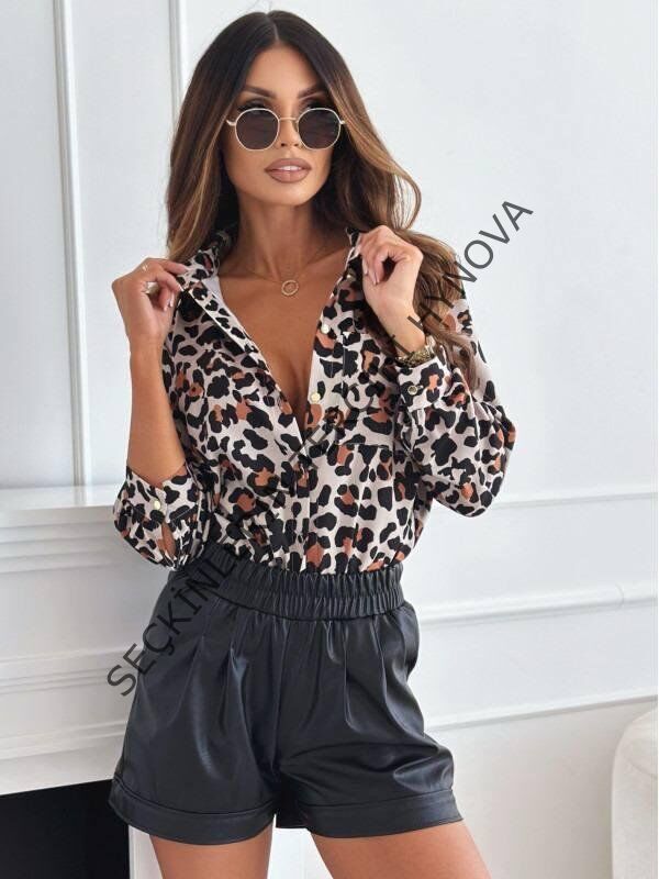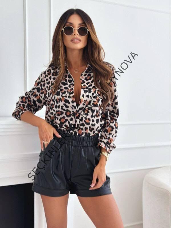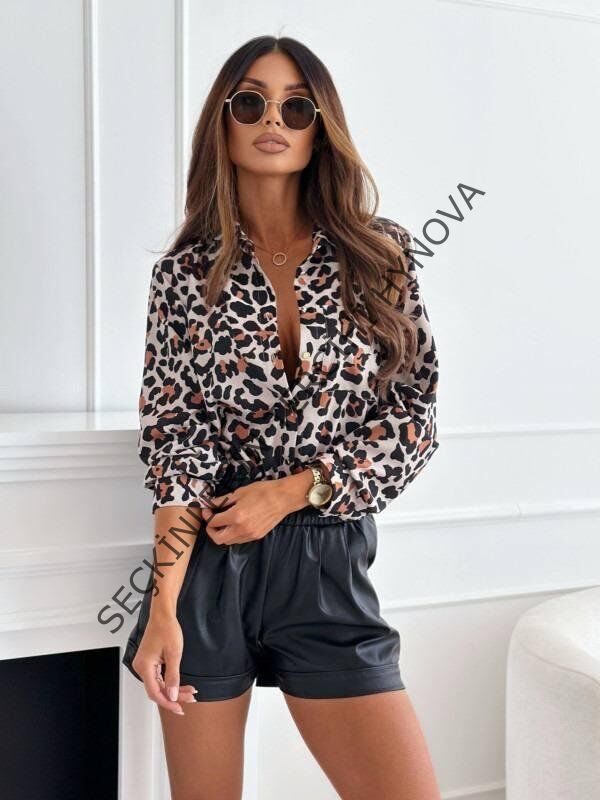 Kadın Uzun Kol Cep Detay Leopar Baskılı Mosskrep Kumaş Gömlek
