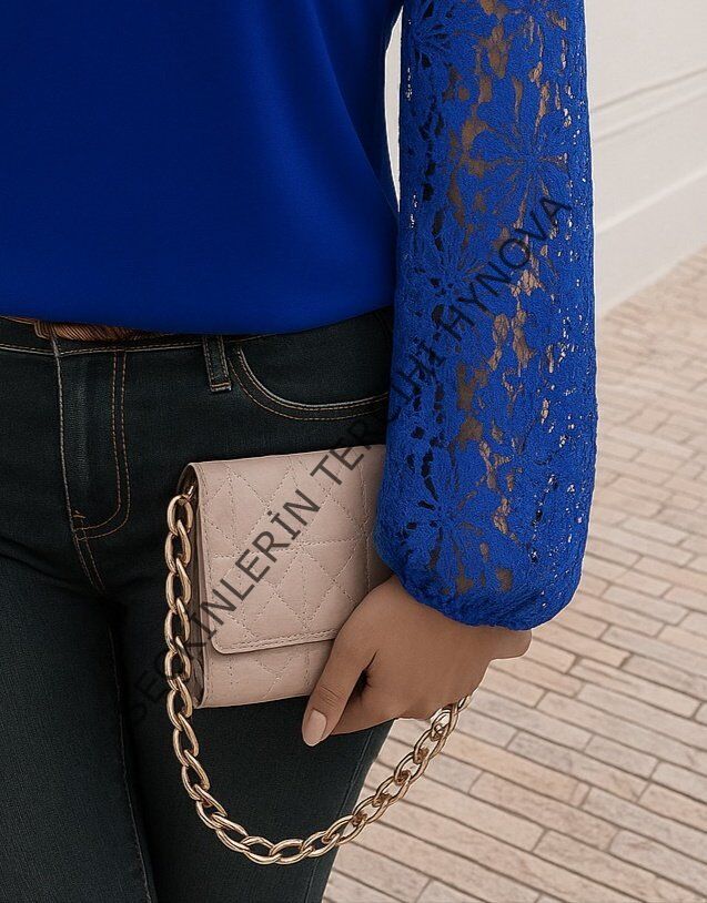 Kadın Uzun Kollu Asimetrik Yakalı Dantelli Ithal Krep Bluz