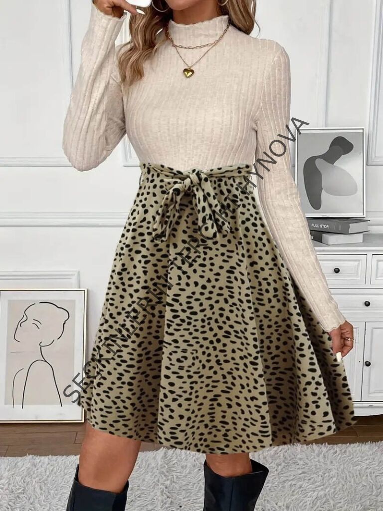 Kadın Uzun Kollu Balıkçı Yaka Belden Bağlamalı üst Kaşkorse Eteği Dalgıç Elbise