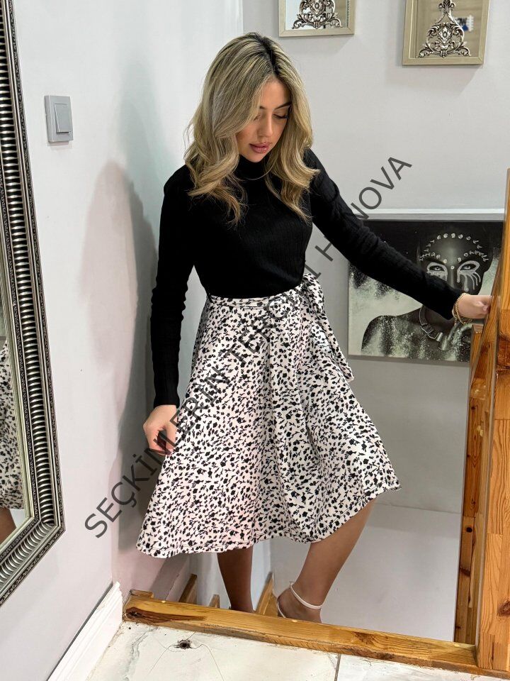 Kadın Uzun Kollu Balıkçı Yaka Belden Bağlamalı üst Kaşkorse Eteği Dalgıç Kısa Elbise