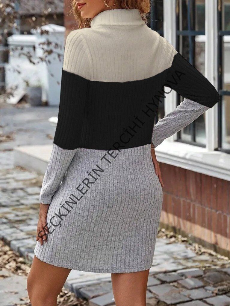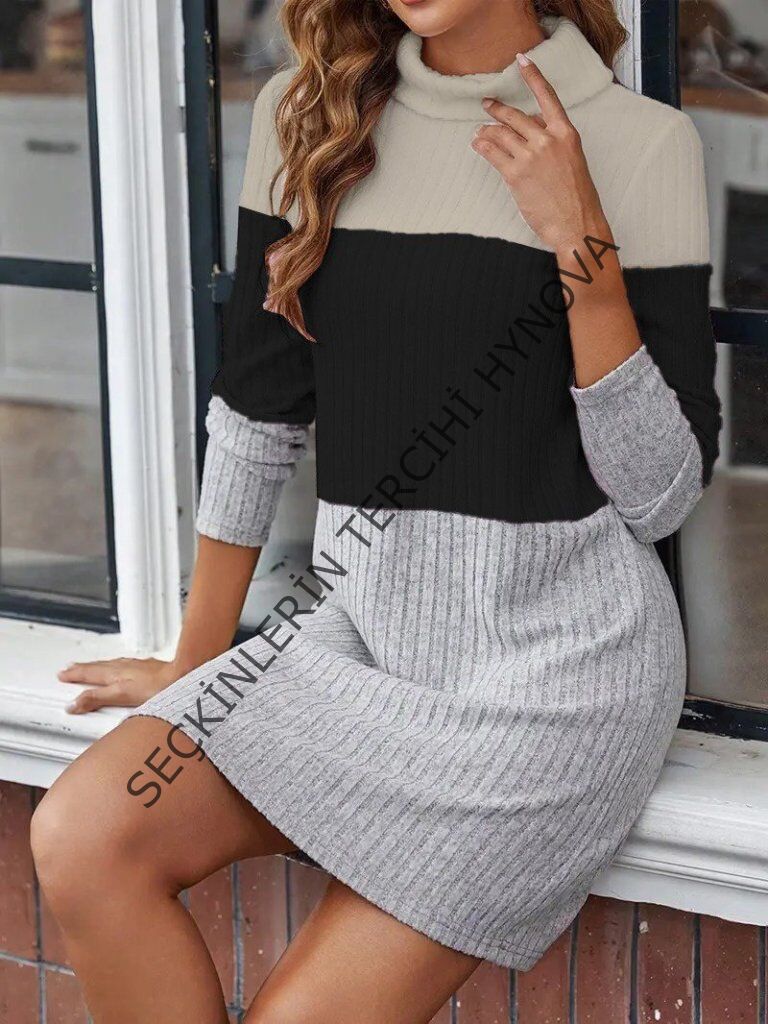 Kadın Uzun Kollu Balıkçı Yaka çizgili çok Renkli Mini şardonlu Kaşkorsel Elbise