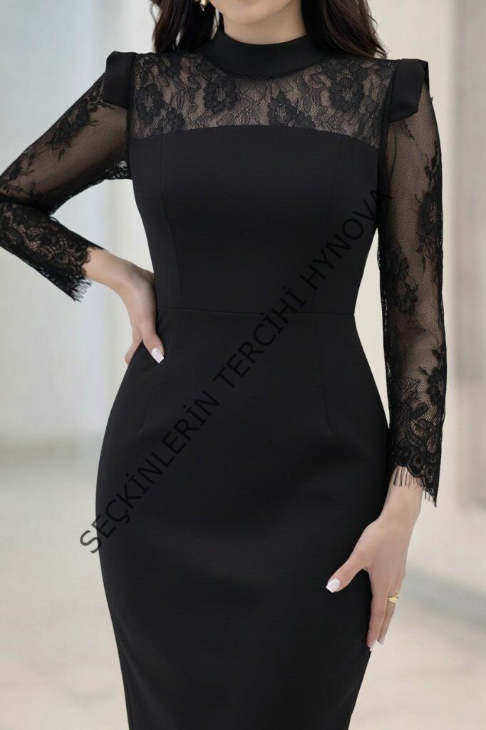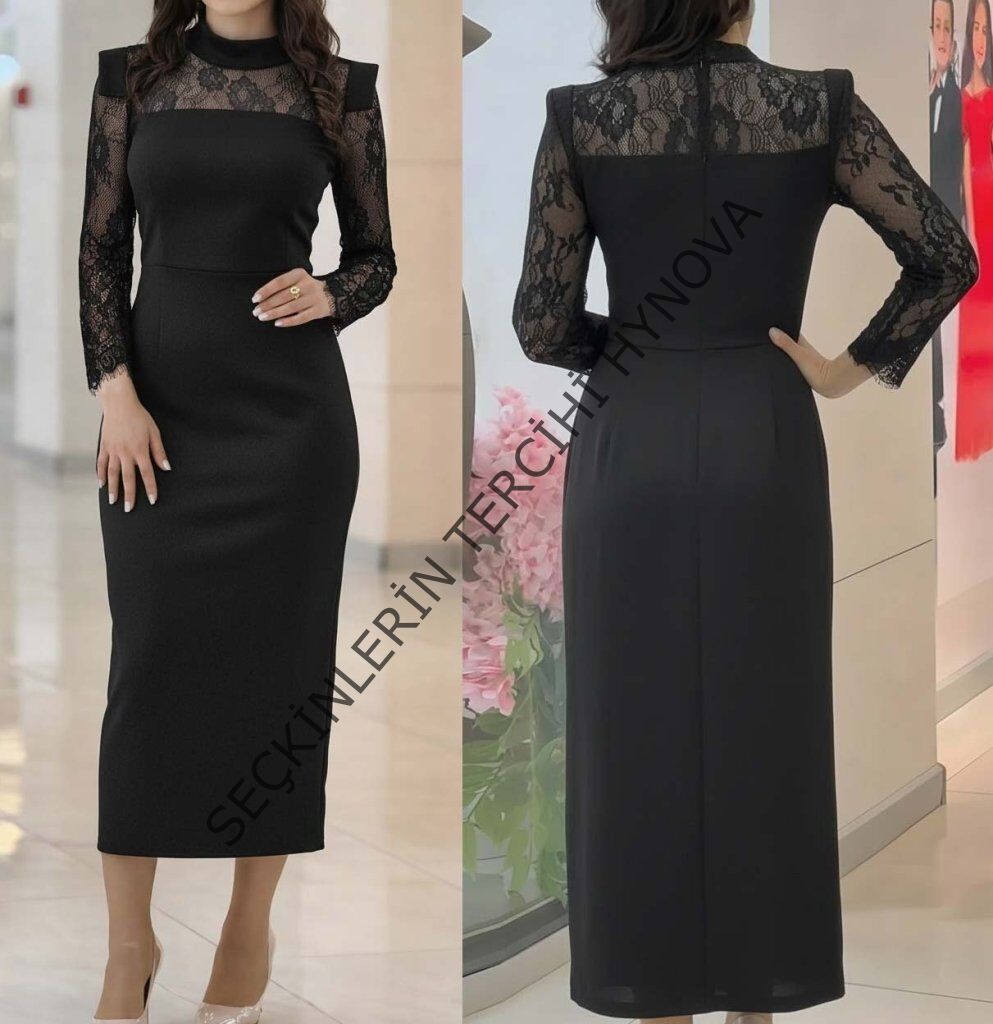 Kadın Uzun Kollu Balıkçı Yaka Dantel Detaylı Midi Ithal Krep Elbise
