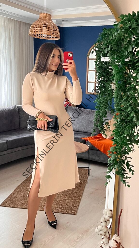 Kadın Uzun Kollu Balıkçı Yaka Derin Yırtmaç Detay Krep Elbise