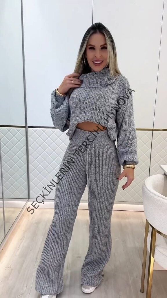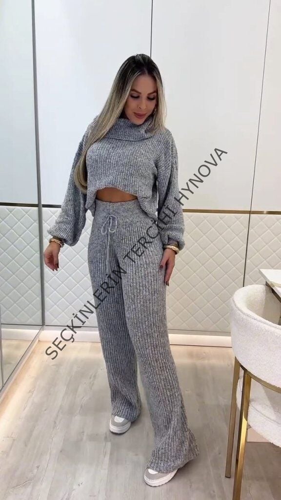 Kadın Uzun Kollu Balıkçı Yaka Kısa Triko Bluz Ve Pantolon Ikili Takım