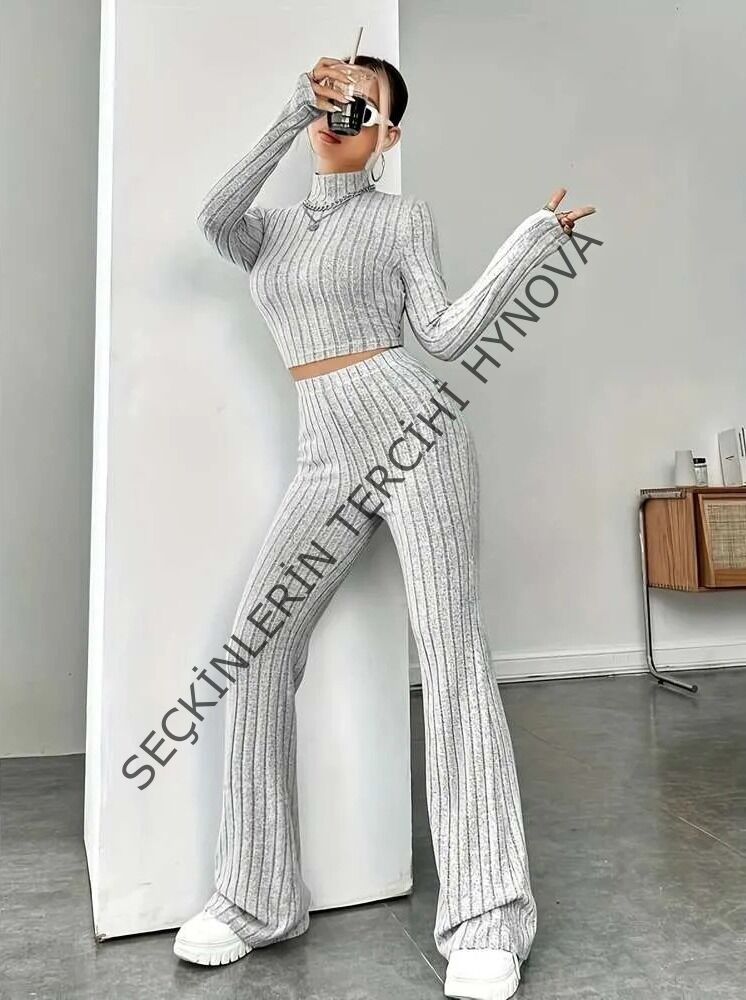 Kadın Uzun Kollu Balıkçı Yaka Krop Ve Pantolon şardonlu Kaşkorse Ikili Takım