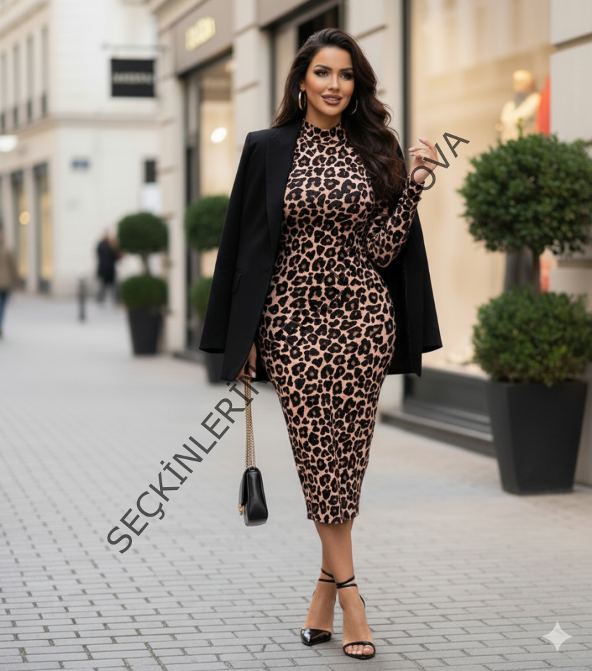 Kadın Uzun Kollu Balıkçı Yaka Leopar Desenli Midi Boy Elbise