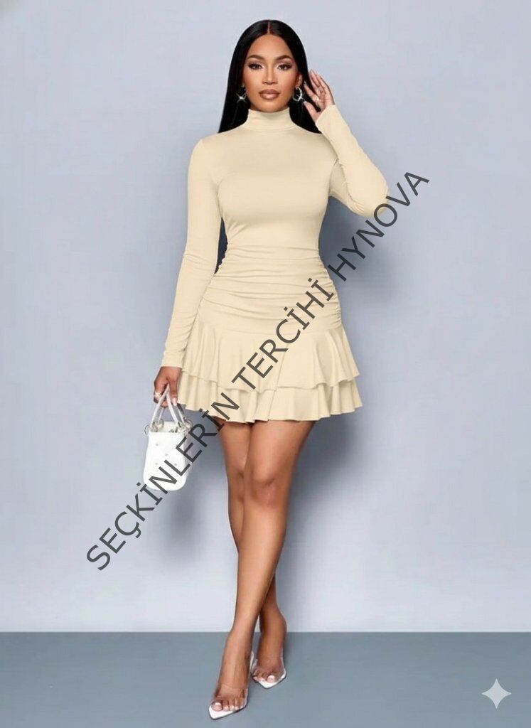 Kadın Uzun Kollu Balıkçı Yaka Mini Fırfırlı Sandy Elbise