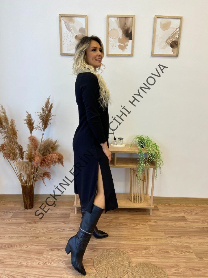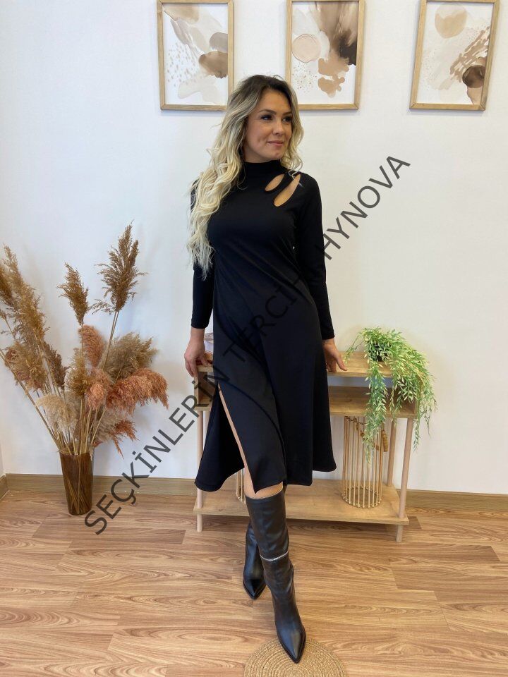 Kadın Uzun Kollu Balıkçı Yaka Omuzda Damla Detaylı Yırtmaçlı Krep Midi Elbise