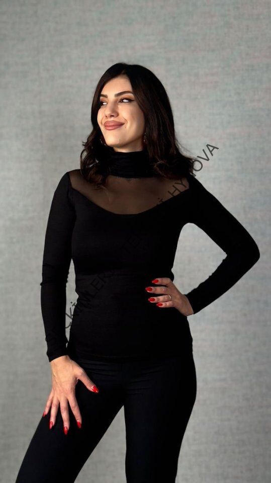 Kadın Uzun Kollu Balıkçı Yaka önü Tül Detay Kaşkorse Kumaş Bluz