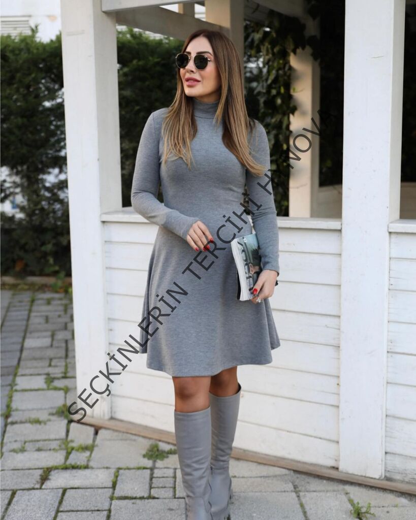 Kadın Uzun Kollu Balıkçı Yaka Salaş Kusa Akrilik Elbise
