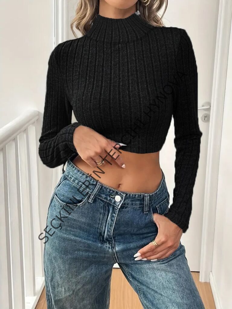 Kadın Uzun Kollu Balıkçı Yaka şardonlu Kaşkorse Krop Bluz