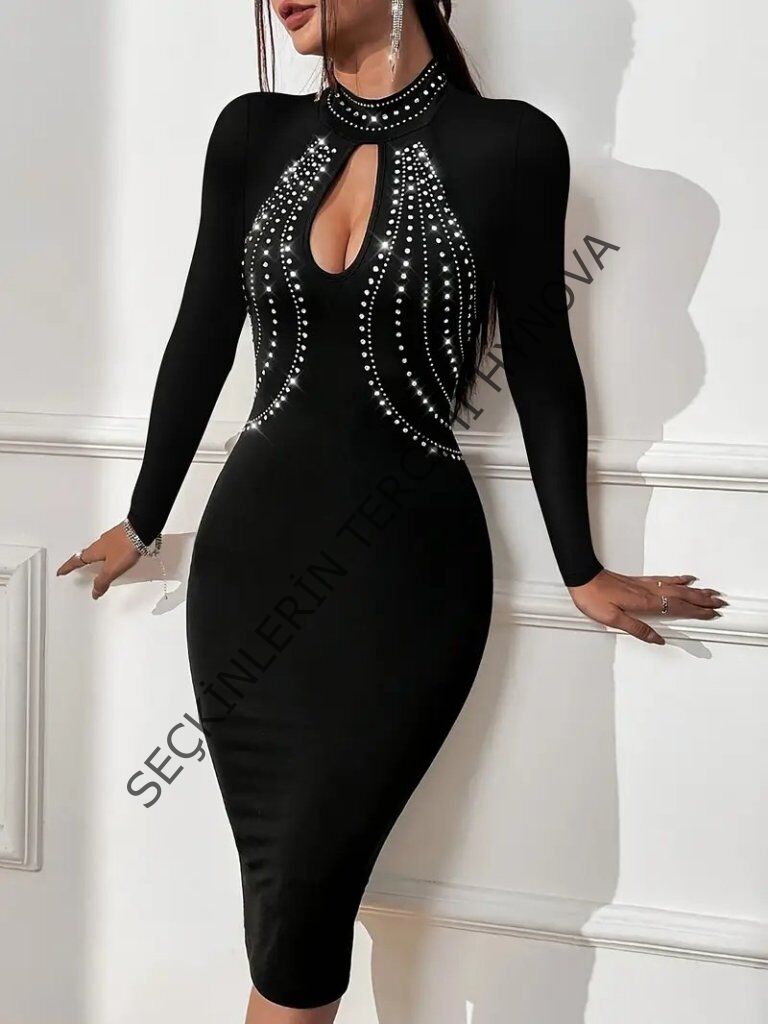 Kadın Uzun Kollu Balıkçı Yaka Taşlı Damla Detay Midi Ithal Krep Elbise