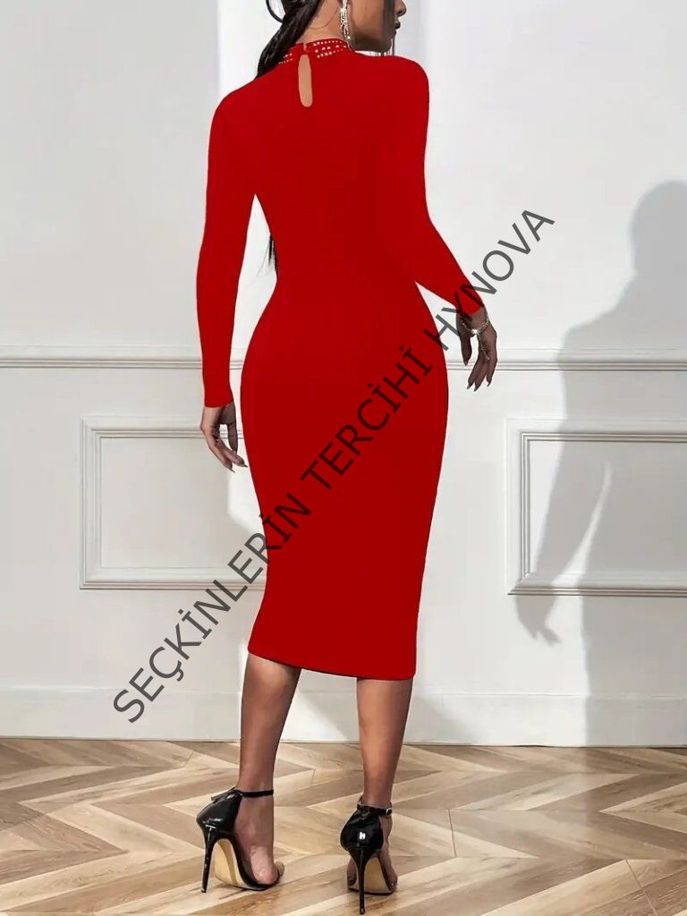 Kadın Uzun Kollu Balıkçı Yaka Taşlı Damla Detay Midi Ithal Krep Elbise
