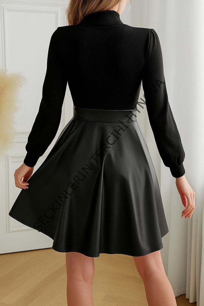Kadın Uzun Kollu Balıkçı Yaka üst Kaşkorse Alt Deri Detaylı Mini Elbise