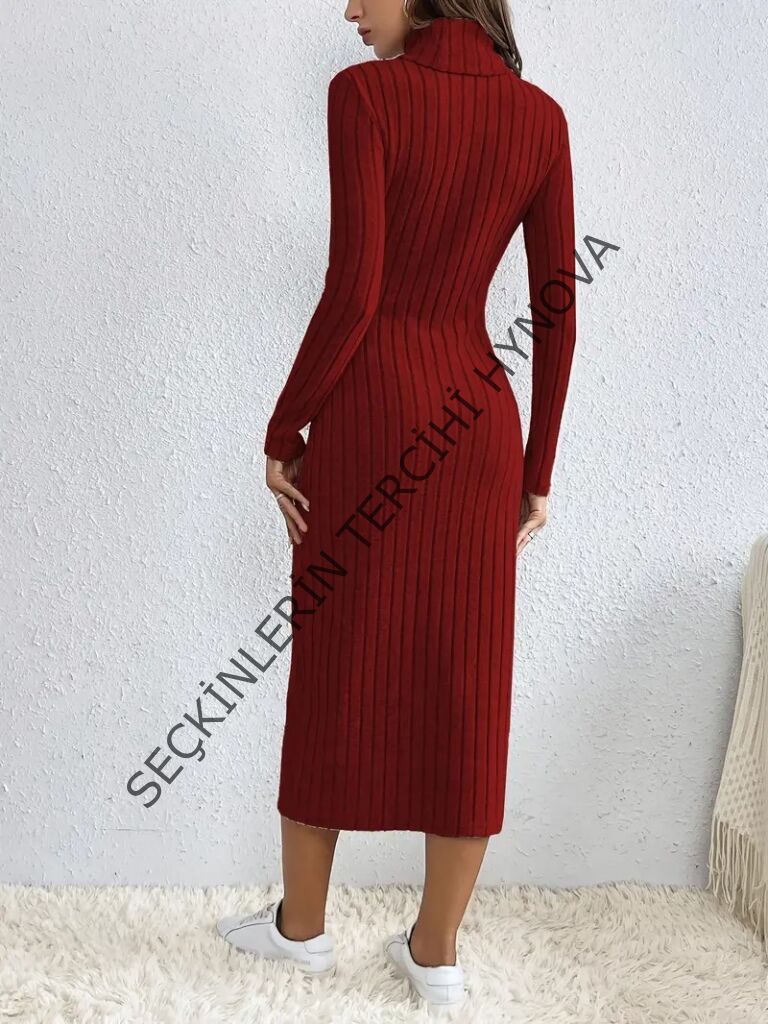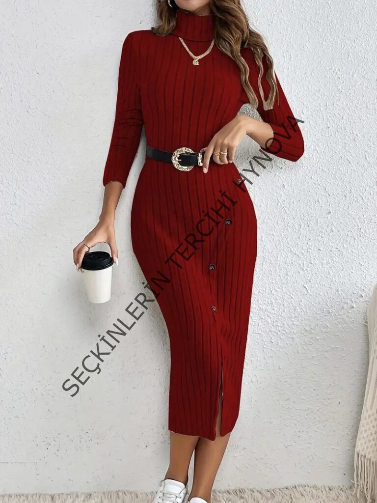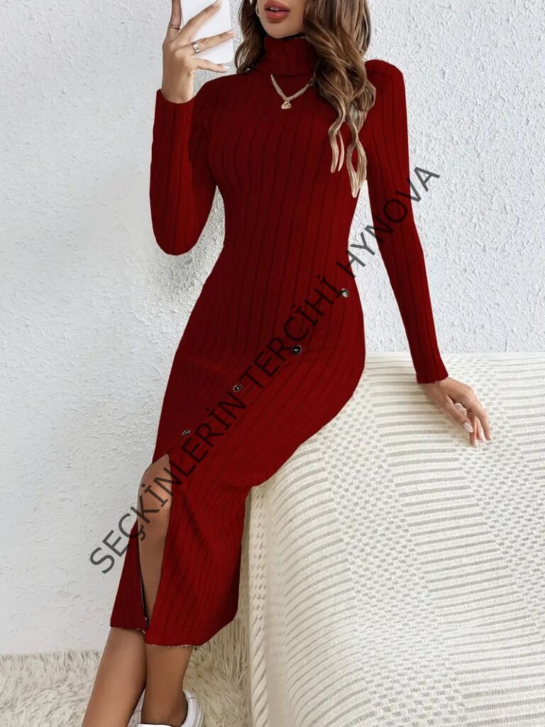 Kadın Uzun Kollu Balıkçı Yaka Yırtmaçlı Düğmeli şardonlu Kaşkorse Elbise