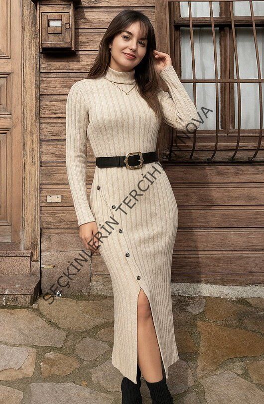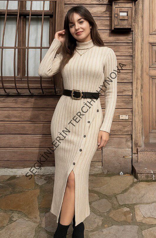 Kadın Uzun Kollu Balıkçı Yaka Yırtmaçlı Düğmeli şardonlu Kaşkorse Elbise