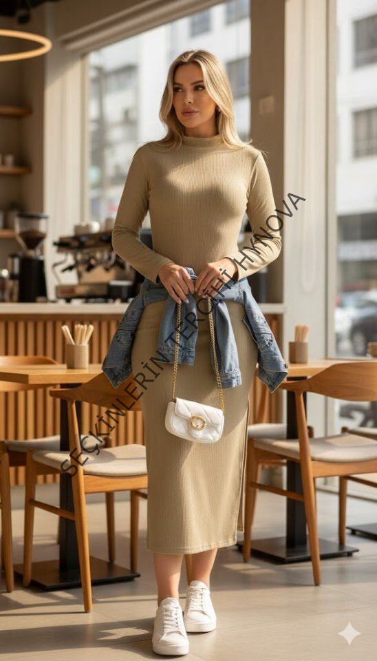 Kadın Uzun Kollu Balıkçı Yakalı Yanlardan Yırtmaçlı Kaşkorse Maxi Elbise