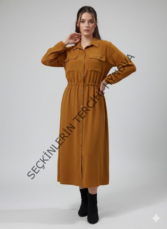 Kadın Uzun Kollu Beli Lastik Ve Düğme Detay Gömlek Elbise