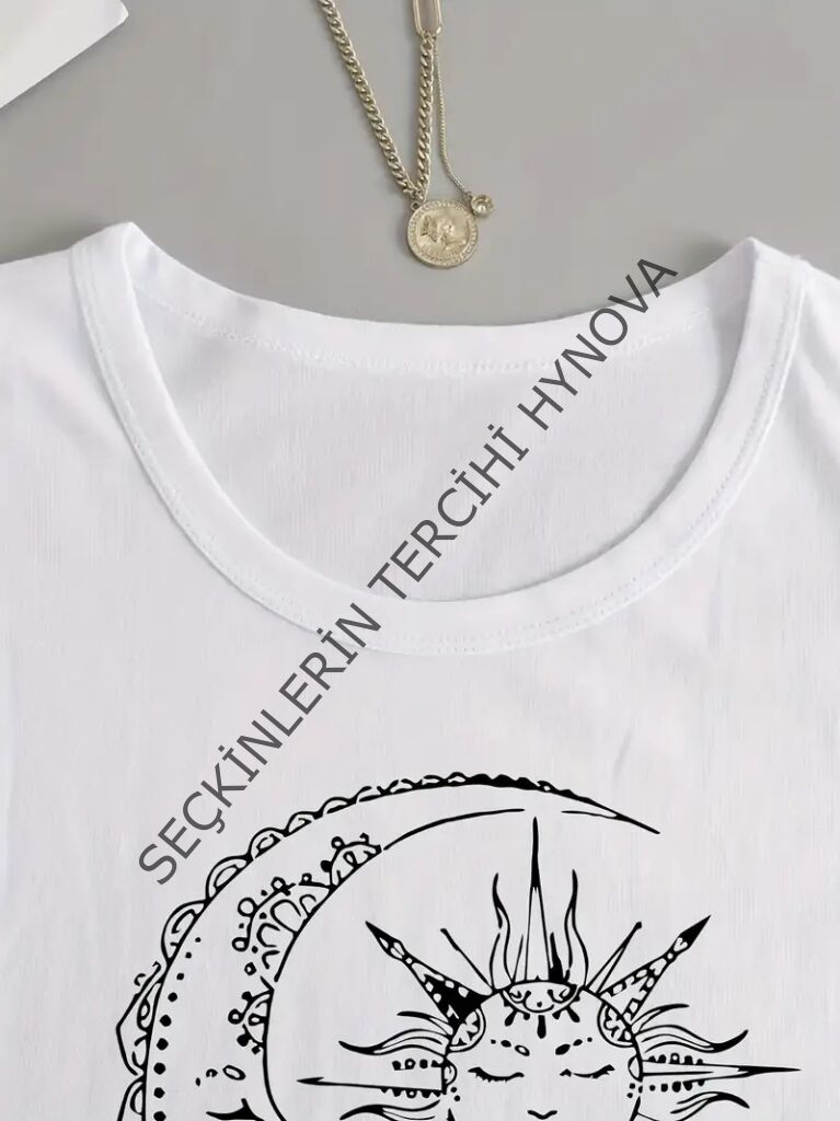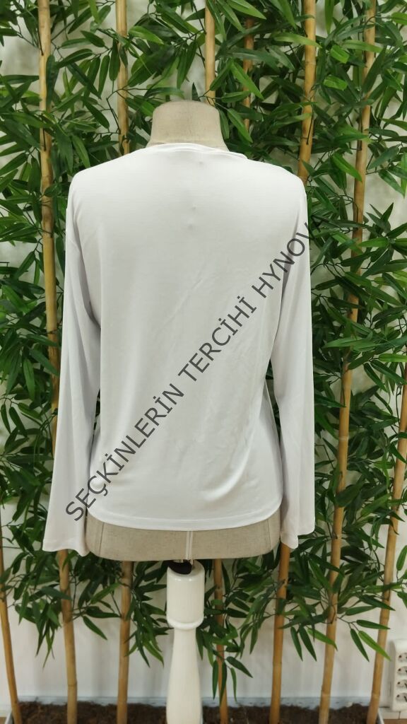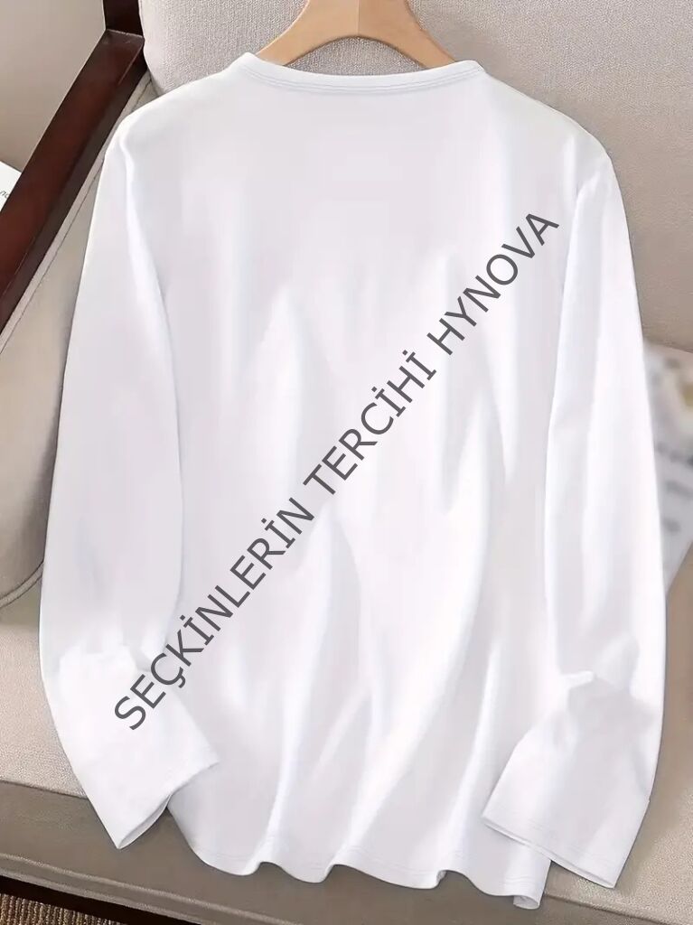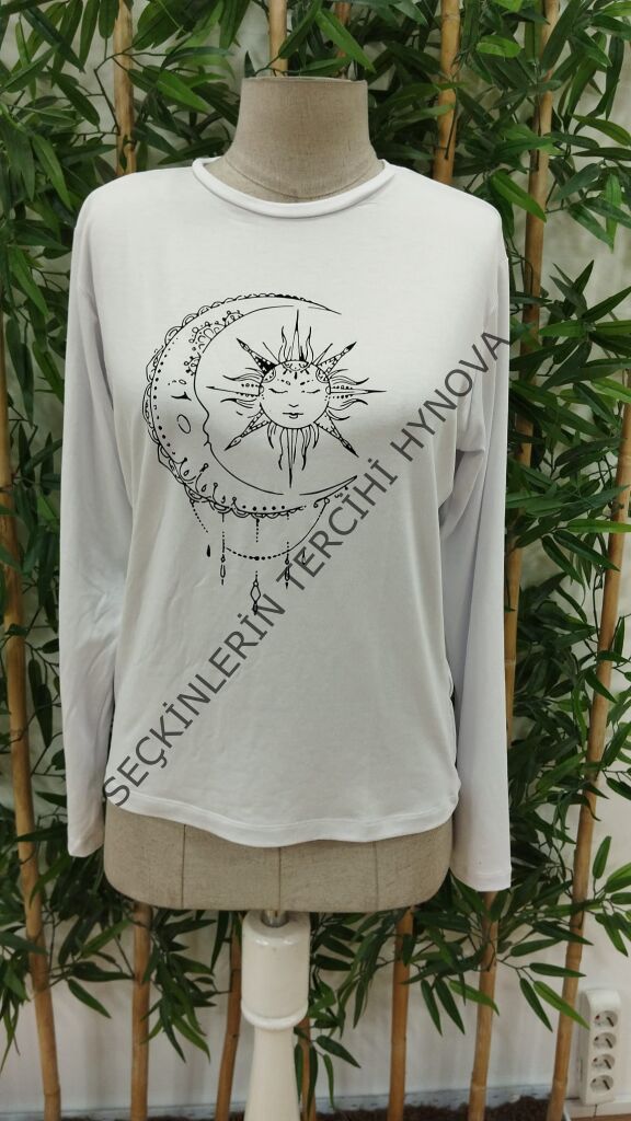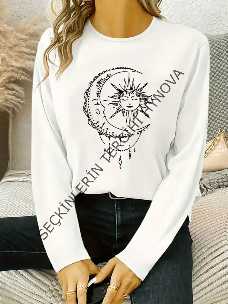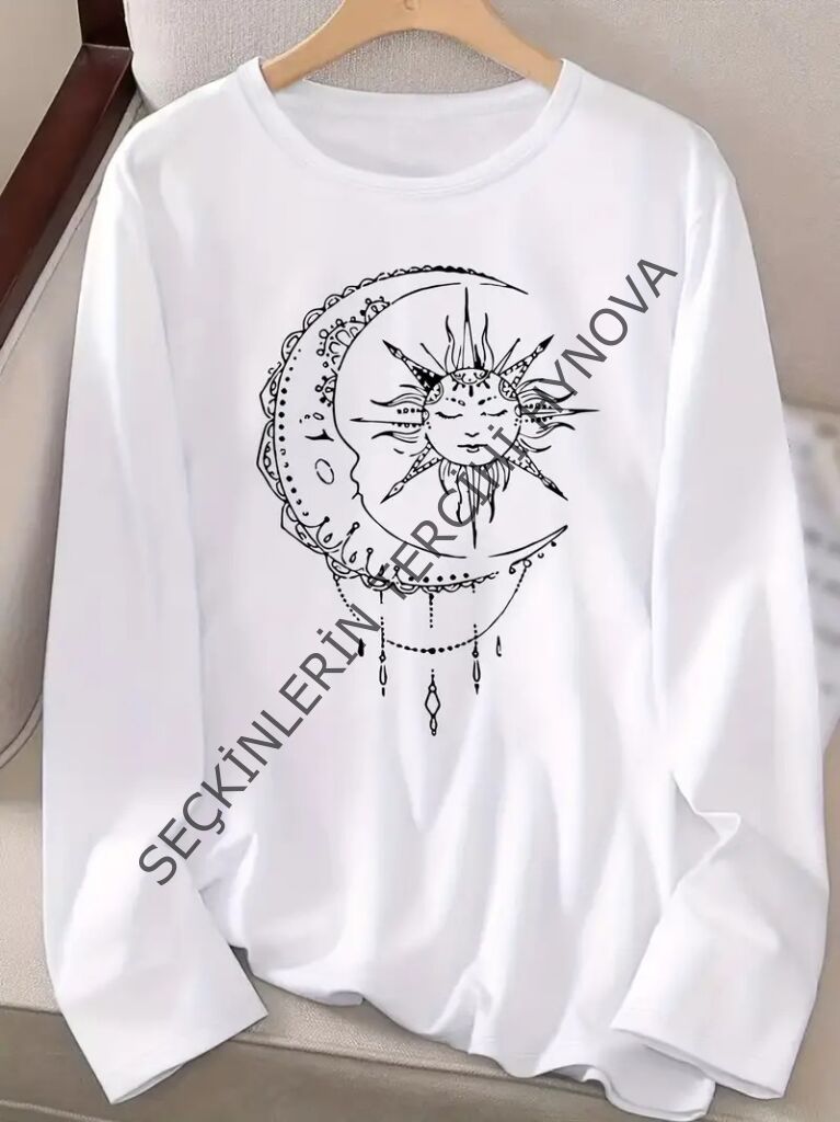 Kadın Uzun Kollu Bisiklet Yaka Ay Baskılı Viskon Bluz