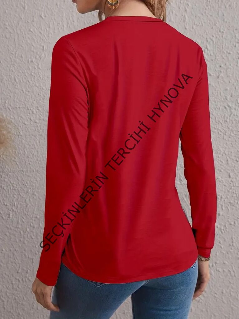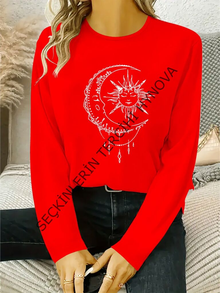 Kadın Uzun Kollu Bisiklet Yaka Ay Baskılı Viskon Bluz
