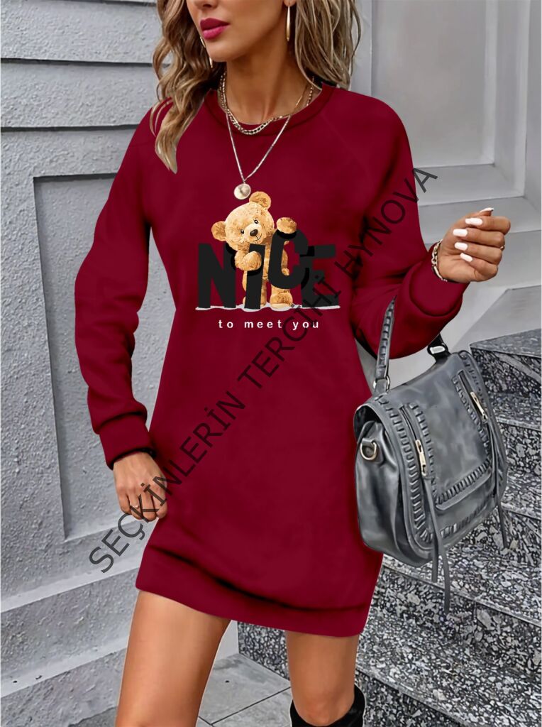 Kadın Uzun Kollu Bisiklet Yaka Ayı Desenli Viskon Iki Iplik Elbise