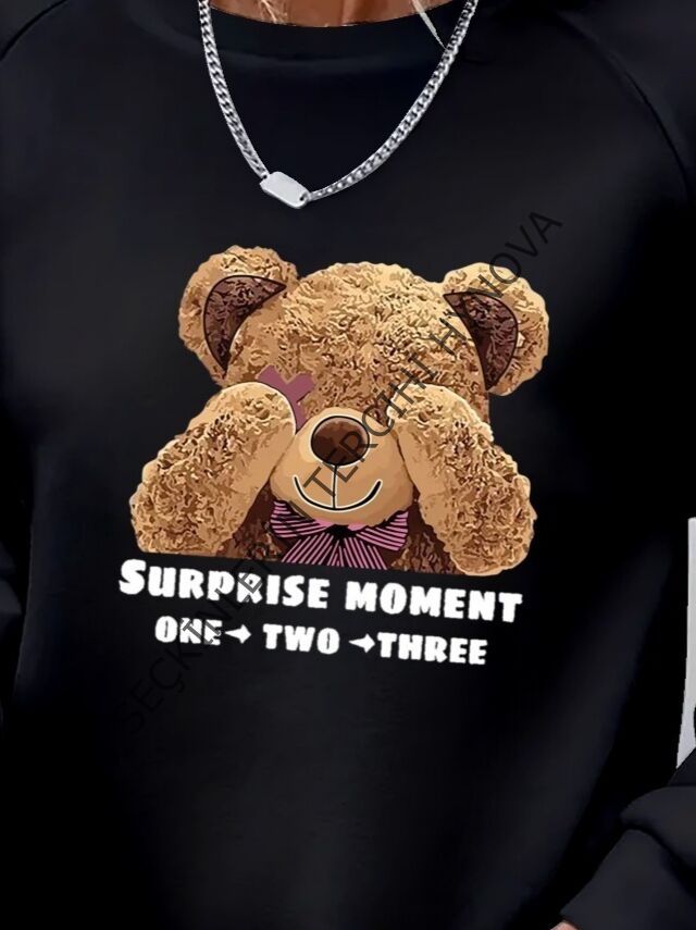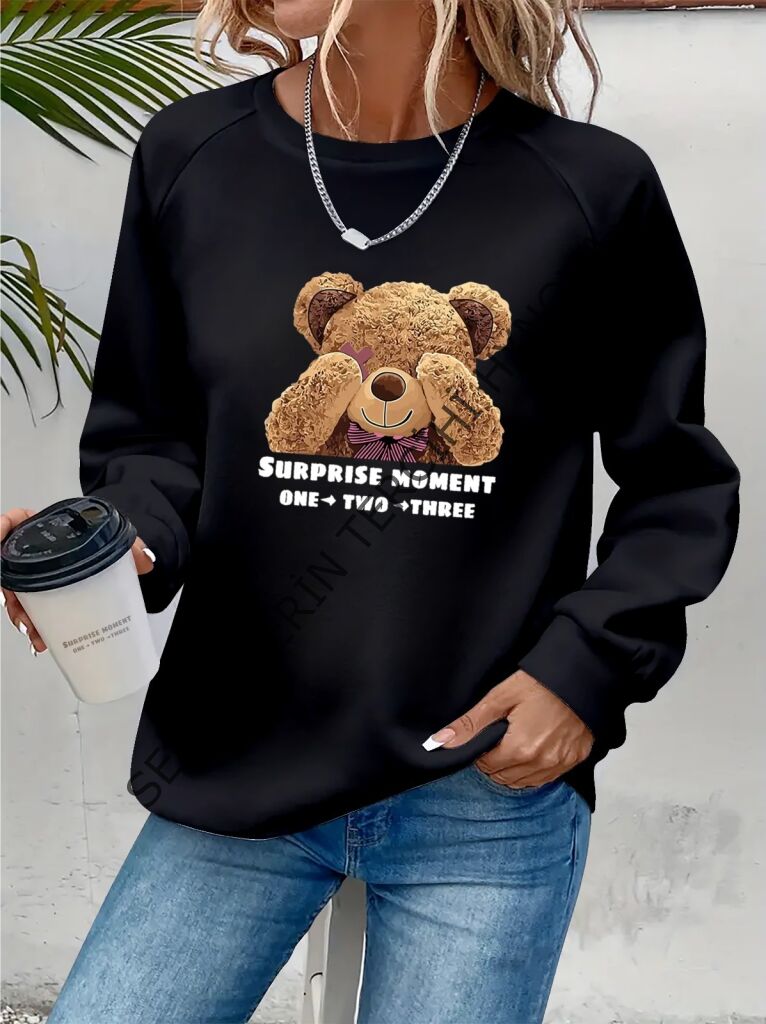 Kadın Uzun Kollu Bisiklet Yaka Ayıcık Desenli Viskon Iki Iplik Bluz